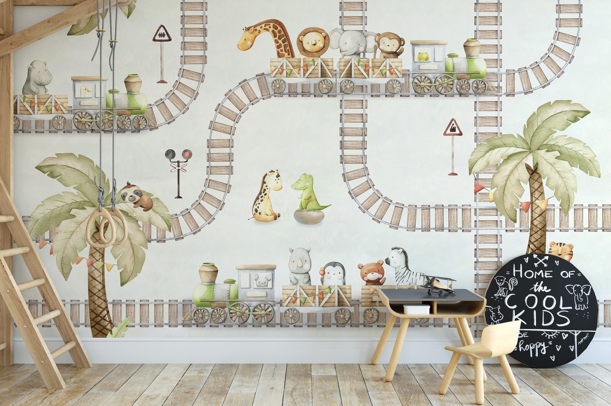 Bring the adventure of train travels nursery room wallpaper mural into your baby's nursery. Featuring cute animals on a charming train journey, this wallpaper adds a playful touch to any nursery room. Your child will love spotting the friendly giraffe, cuddly bear, and adorable elephant as they go on their imaginary travels. This mural is not just visually appealing but also durable and easy to clean, making it perfect for a nursery. Order now and let the Train Travels Nursery Room Wallpaper Mural become the backdrop for countless adventures. Perfect for creating a cheerful and engaging nursery environment.