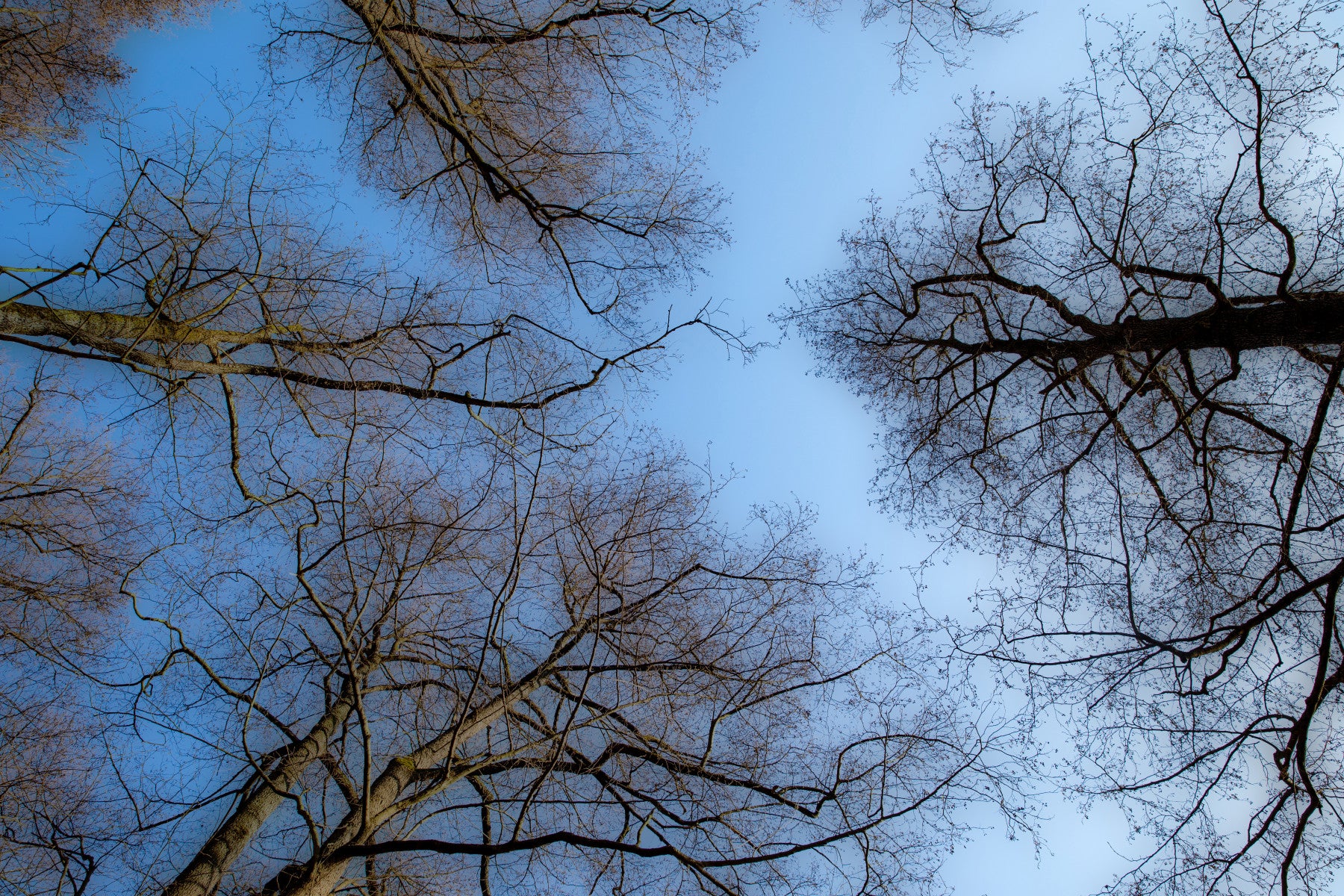 This artwork presents a unique perspective of nature, showcasing the intricate branches of trees reaching towards a clear blue sky. The composition invites contemplation, revealing the beauty in simplicity and the transition of seasons.