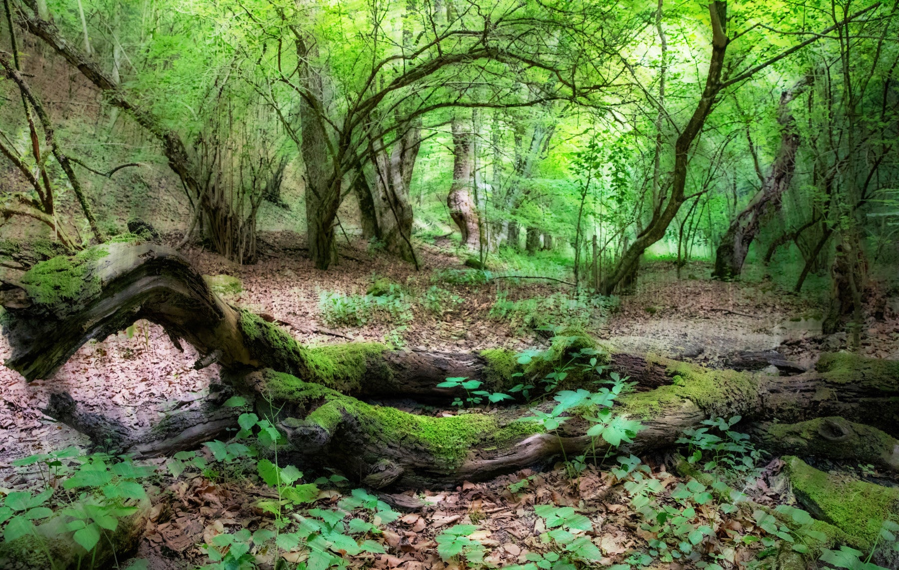 This stunning photograph presents a serene woodland scene, where vibrant greenery envelops the landscape. The interplay of light and shadow reveals the intricate textures of moss-covered logs and the gentle curves of the trees. Perfect for nature lovers, this piece embodies tranquility and invites a sense of calm into any space.