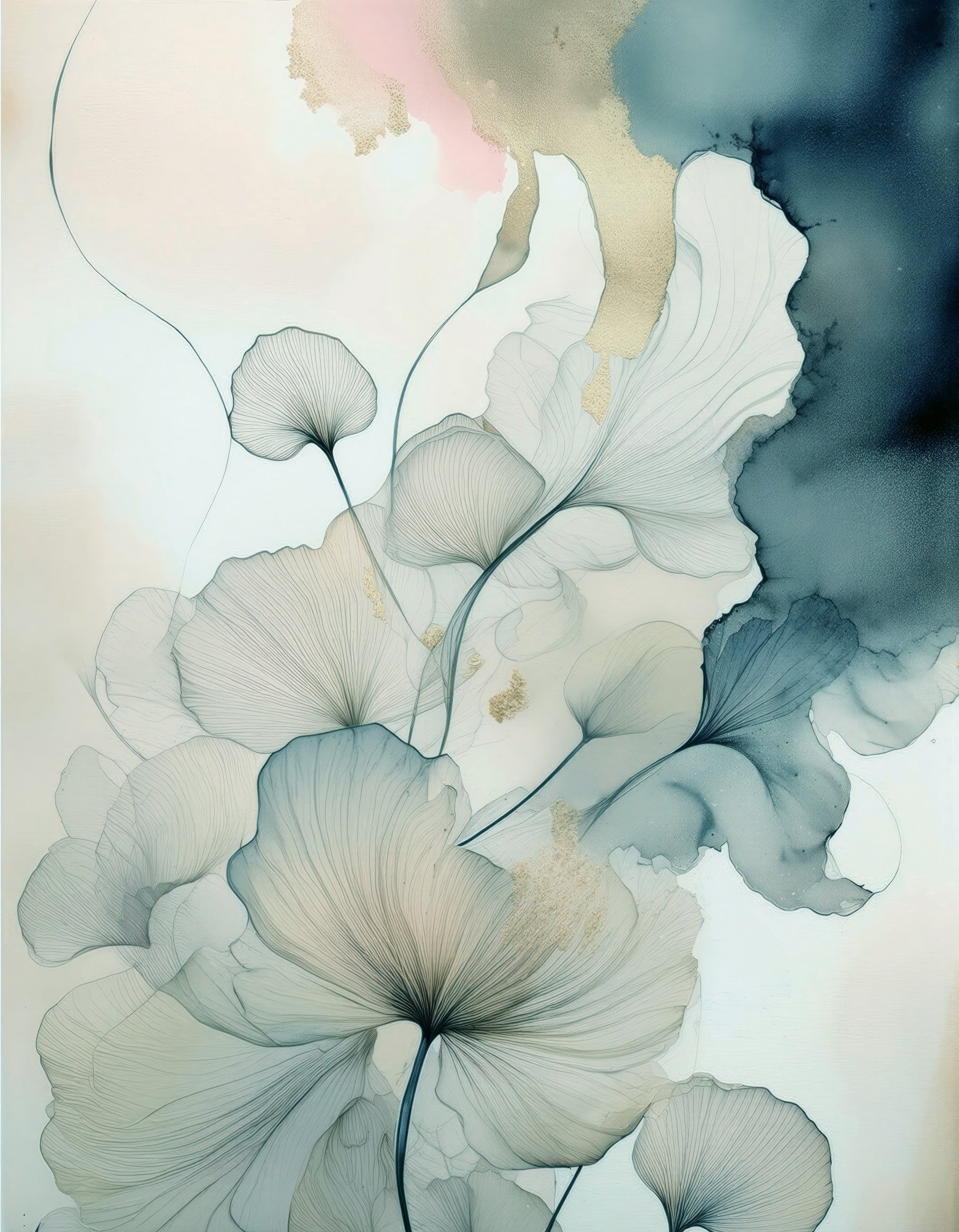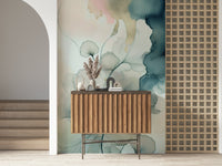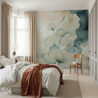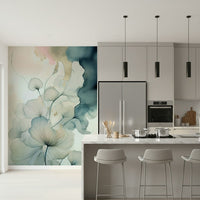 Elevate your décor with this serene floral wallpaper. Translucent petals in shades of grey and teal offer a soft, dreamy look, accented with shimmering gold highlights. This wallpaper for walls breathes new life into any space, adding a delicate, airy ambiance. It's an excellent option for bedrooms, bathrooms, and hallways. The calming colour palette and elegant design integrate well with both modern and classic interiors, creating a peaceful and refined atmosphere.