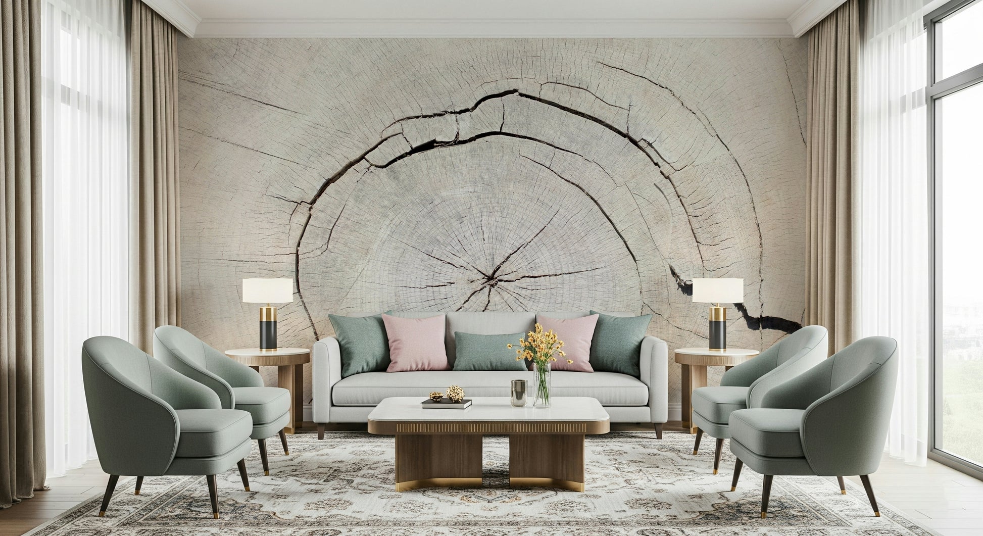 Present a touch of natural charm with this wood grain design! Explore the beauty of tree rings presented with this high-resolution wallpaper for walls. The stark contrast highlights the passage of time, forming an organic abstract. It fits perfectly in modern living rooms, studies, or even hallways. Imagine this design infusing a sense of quiet sophistication into your home. It complements minimalist interiors and adds a textural element to enhance your decor.