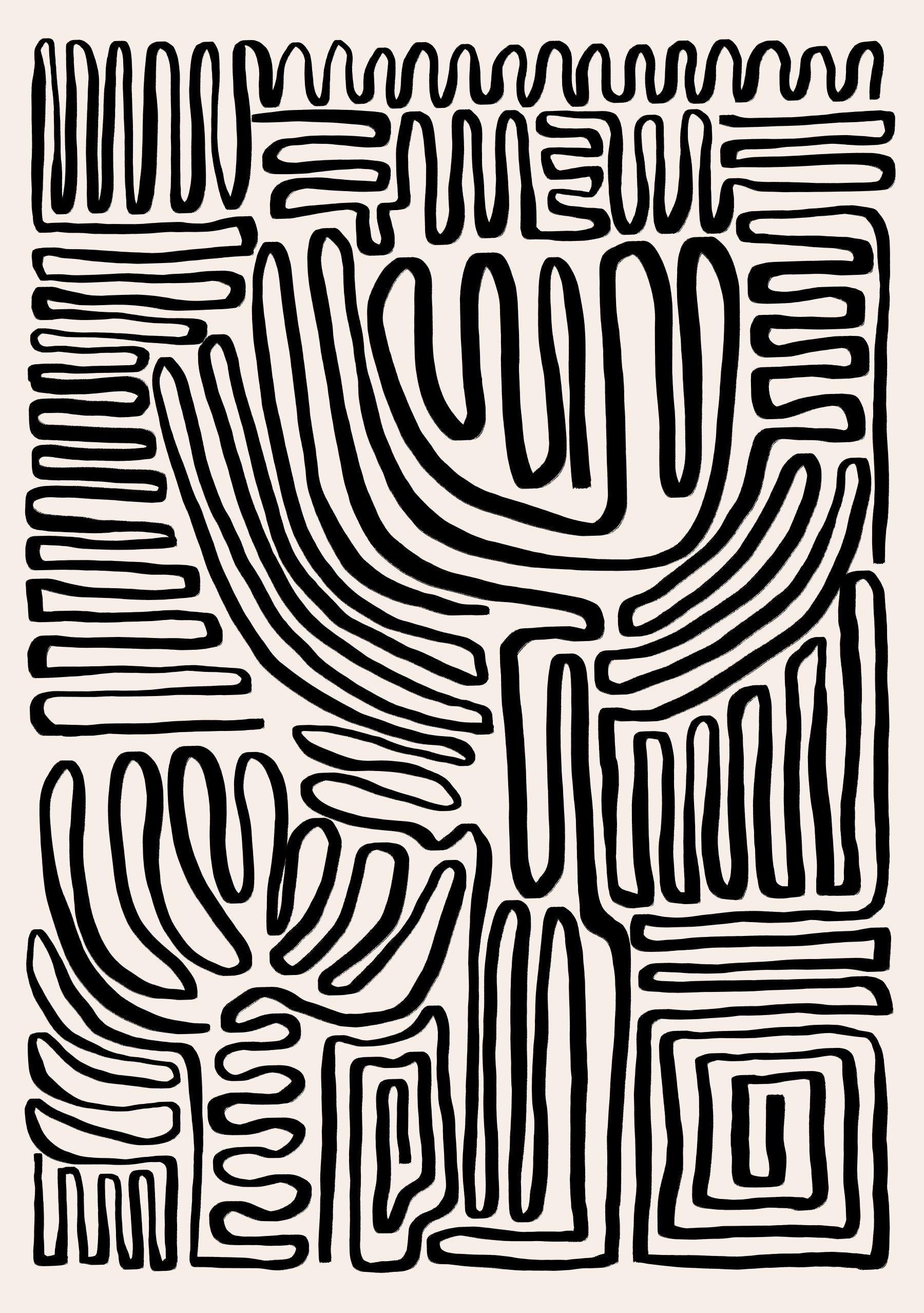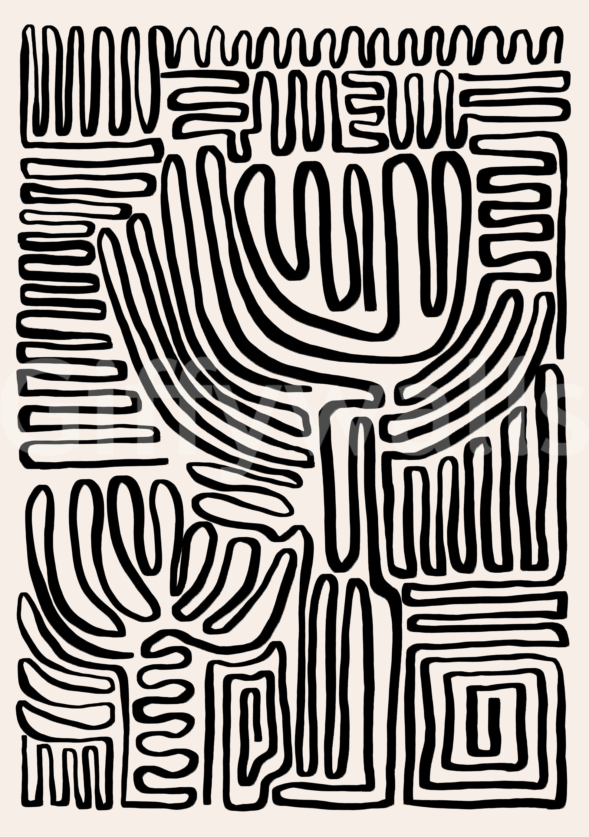 Invite an element of raw, artistic expression into your home with this tribal-inspired wallpaper for walls. Bold, black lines weave across a creamy background, forming evocative, abstract shapes reminiscent of ancient art. This design works well in a dining room, lending a grounding, yet refined aesthetic. Its minimalist colour scheme allows it to integrate seamlessly with existing furnishings. Install it in a bedroom for a serene atmosphere, where the rhythmic patterns foster a sense of calm. It offers an engaging visual texture, serving to enrich and modernise a variety of interior spaces.