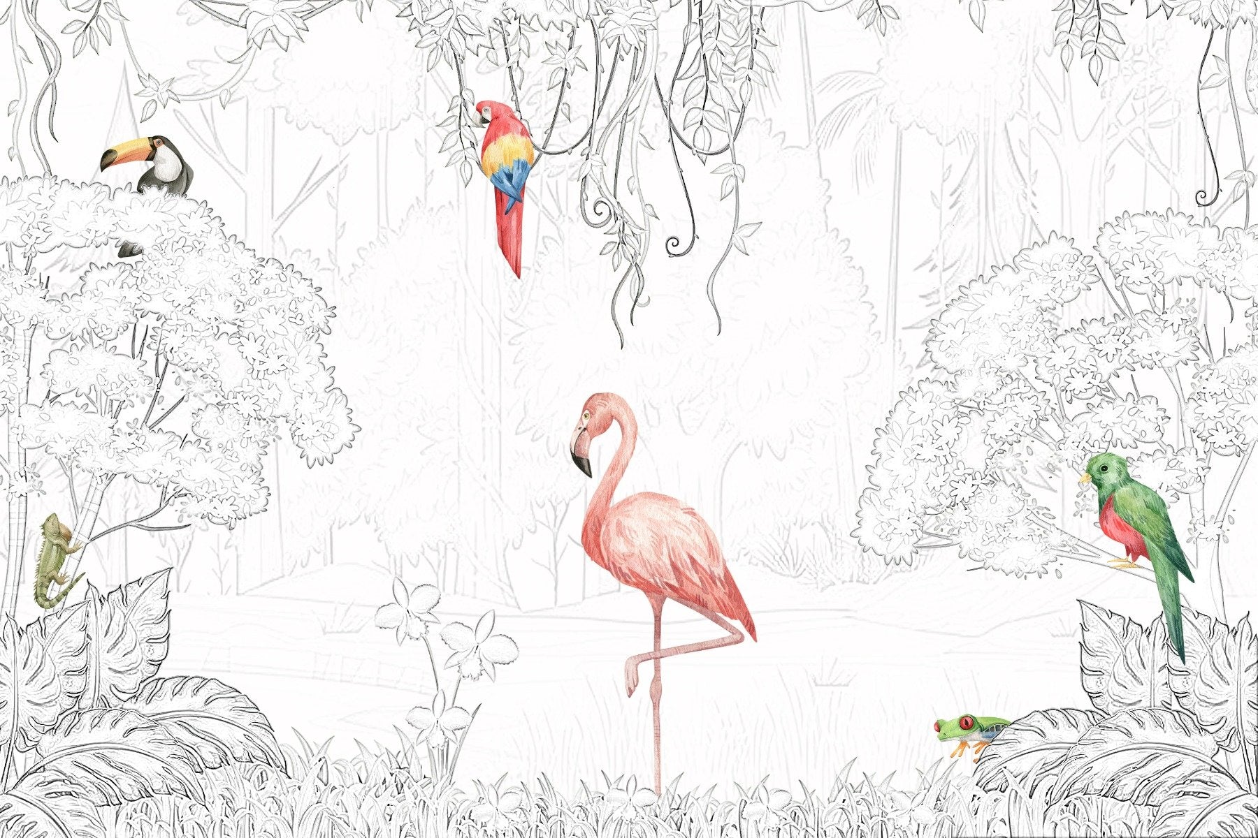 This mural celebrates the beauty and vibrancy of the tropics, inviting the spirit of the rainforest into your home with a touch of artistic whimsy. Each bird, from the elegant flamingo to the playful parrot, is depicted in a burst of colour that stands out against the monochrome background, creating a stunning visual impact.