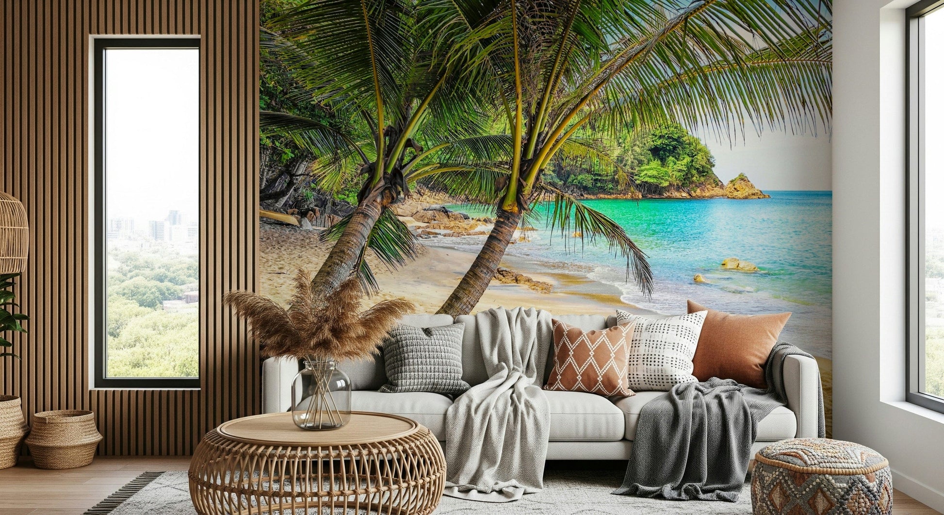 Transform your space into a serene paradise with this captivating beach scene. The wallpaper for walls brings a sense of calm and relaxation, showcasing lush palm trees against a backdrop of turquoise water and sandy shores. The vibrant colours and detailed imagery evoke a sense of wanderlust and create an inviting atmosphere. Ideal for living rooms, bedrooms, or even bathrooms, this wallpaper adds a touch of coastal charm to any interior. Elevate your décor with this stunning design and enjoy a tranquil escape in your own home. The natural elements complement a variety of interior styles, making it a versatile choice for any homeowner.