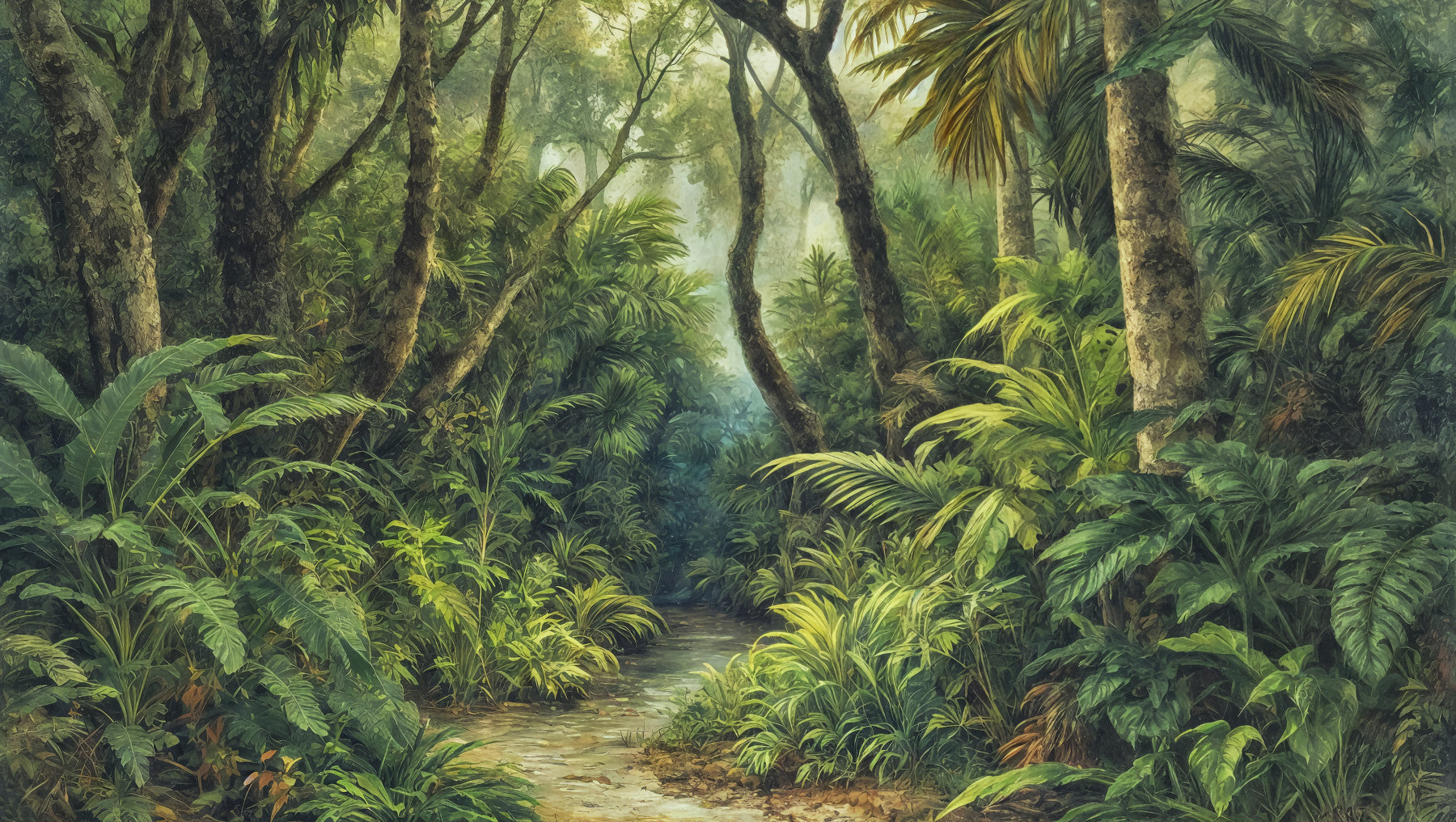 A detailed image of a wall mural featuring a dense jungle canopy.