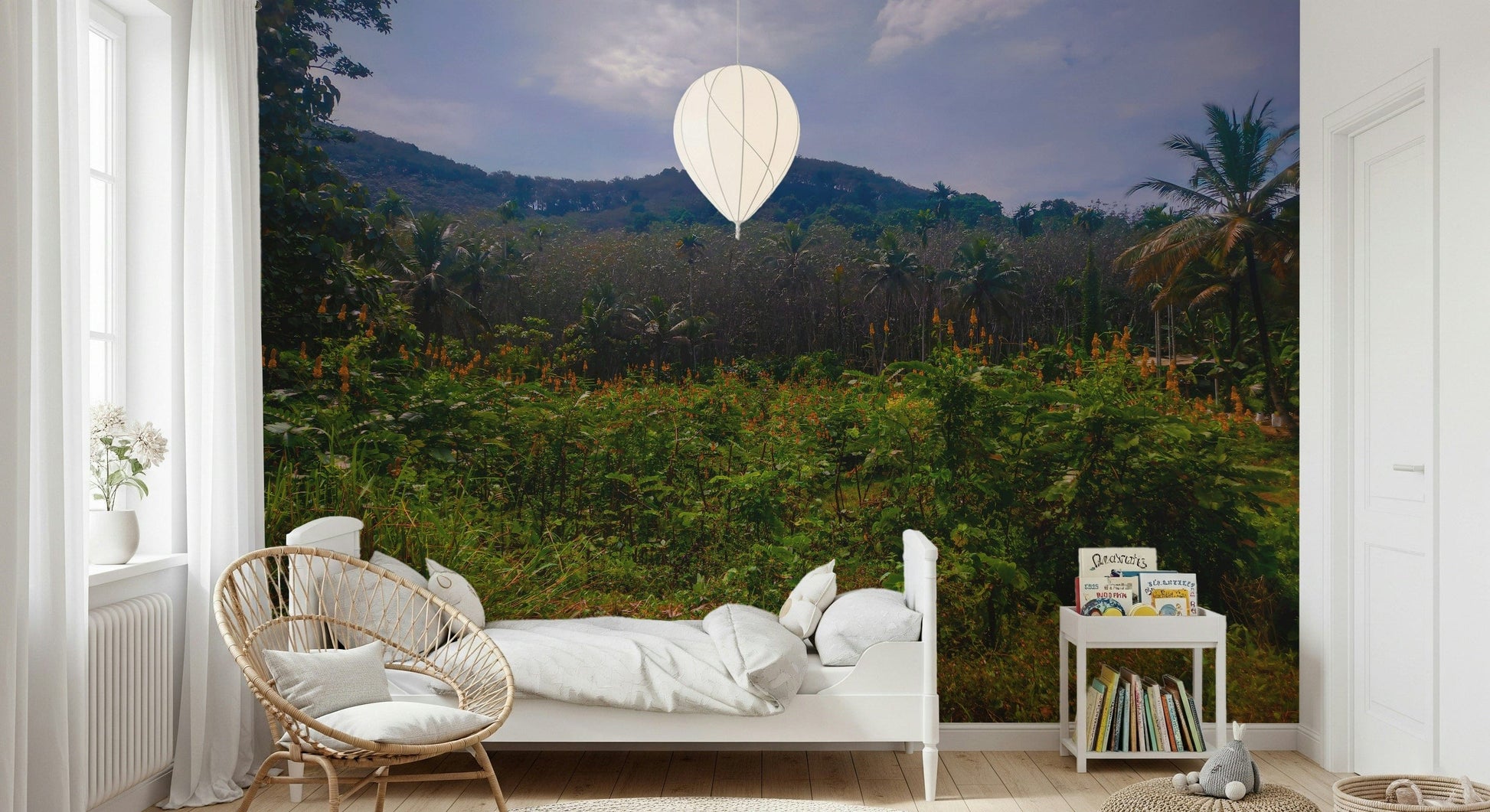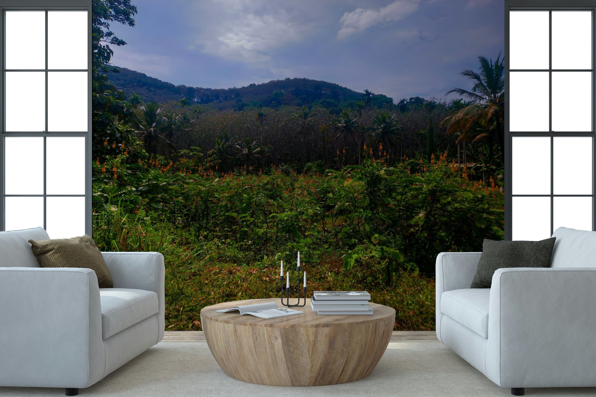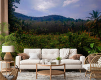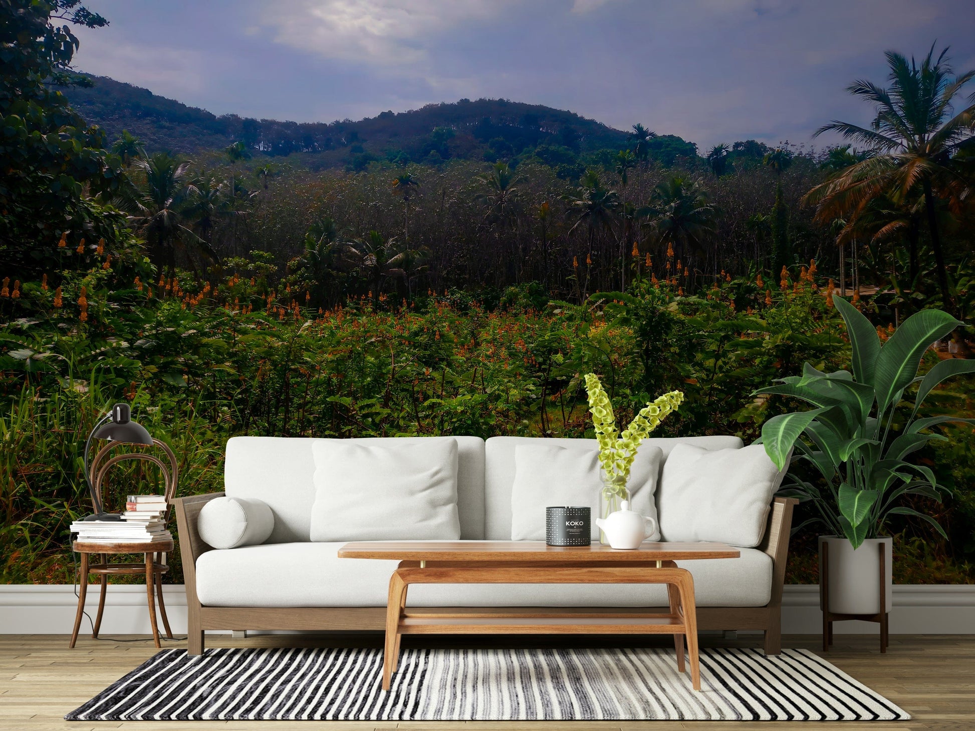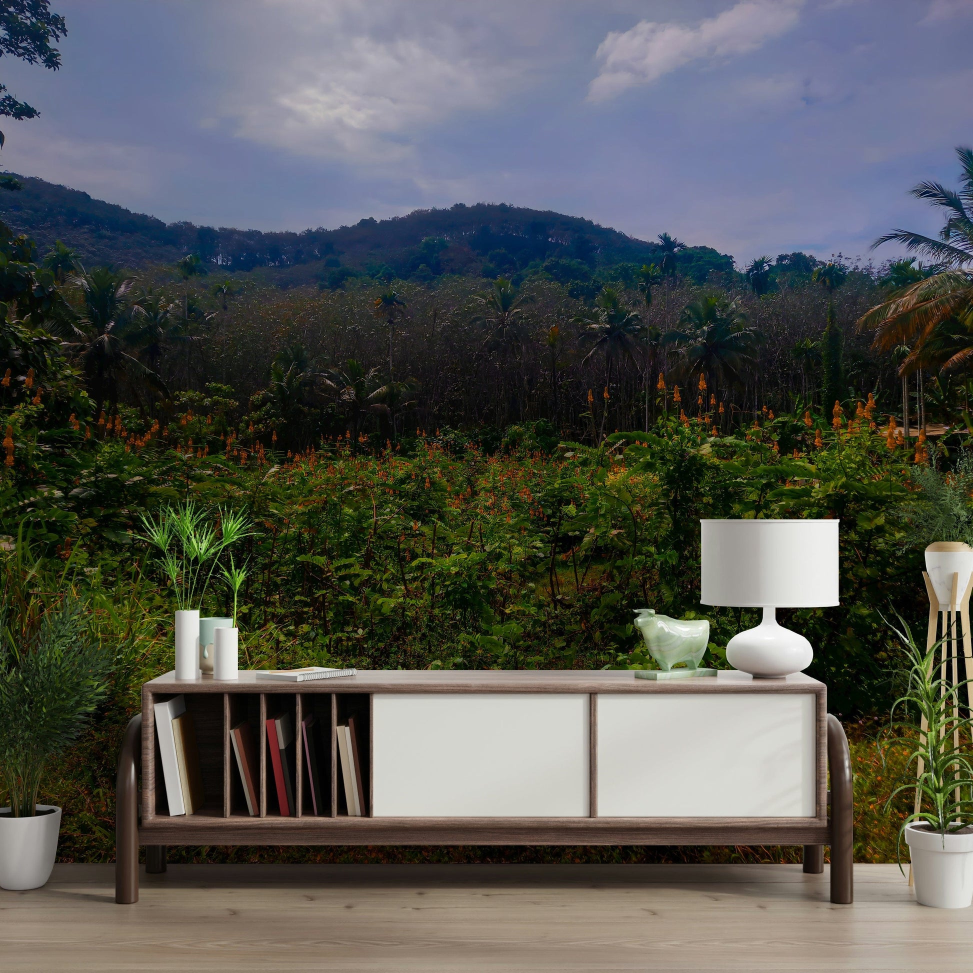 Bring the outdoors in with this captivating landscape wallpaper for walls. This design features a vibrant scene of tropical foliage and distant hills, creating an immersive, nature-inspired atmosphere. The green palette, accented with touches of orange, brings warmth and energy to any room. Ideal for creating a feature wall in your living room or a calming backdrop in your bedroom. This wallpaper adds depth and texture, creating a visually stimulating focal point. The lush design creates a relaxing ambience for your interiors. This wallpaper enhances your space with natural beauty.