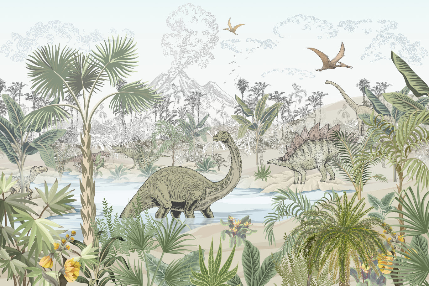 The tropical dinosaur Jungle Wallpaper brings prehistoric adventure to life with detailed illustrations of dinosaurs roaming a lush tropical forest. This dinosaur wallpaper for kids creates an exciting backdrop for bedrooms, playrooms, or classrooms, featuring sauropods, stegosaurs, and pterosaurs. The vibrant greenery and exotic plants add depth to the scene, making it fun and educational. Perfect for young explorers, this prehistoric jungle mural sparks curiosity and imagination. The dino-themed wallpaper for children blends natural colors with playful designs, offering a lively, engaging setting that kids will love. It is ideal for creating a dynamic and adventurous environment.