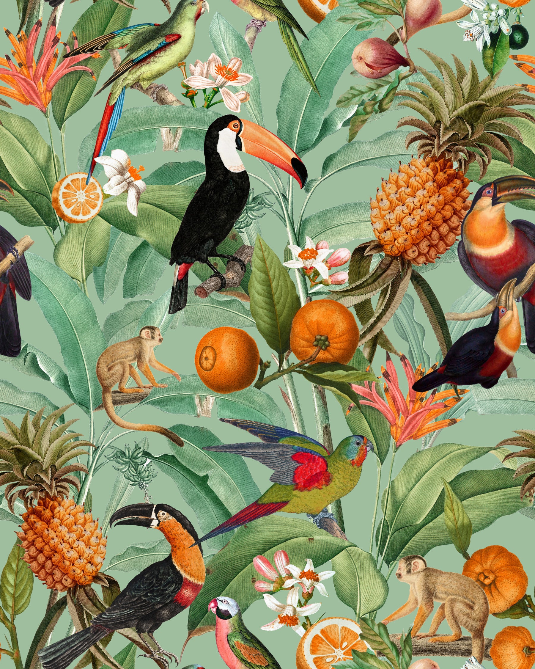 Immerse yourself in a vibrant tropical paradise with this exquisite wallpaper. A lush tapestry of exotic birds, including toucans and parrots, playfully interacts with ripe oranges, pineapples, and lush banana leaves. The soft sage green background enhances the rich, detailed illustrations, creating a serene yet exuberant atmosphere. This wallpaper is perfect for adding a touch of jungle elegance to any room, transporting you to a world of vibrant color and natural beauty. The vintage botanical style adds a touch of classic charm, making it a truly timeless piece for your home.