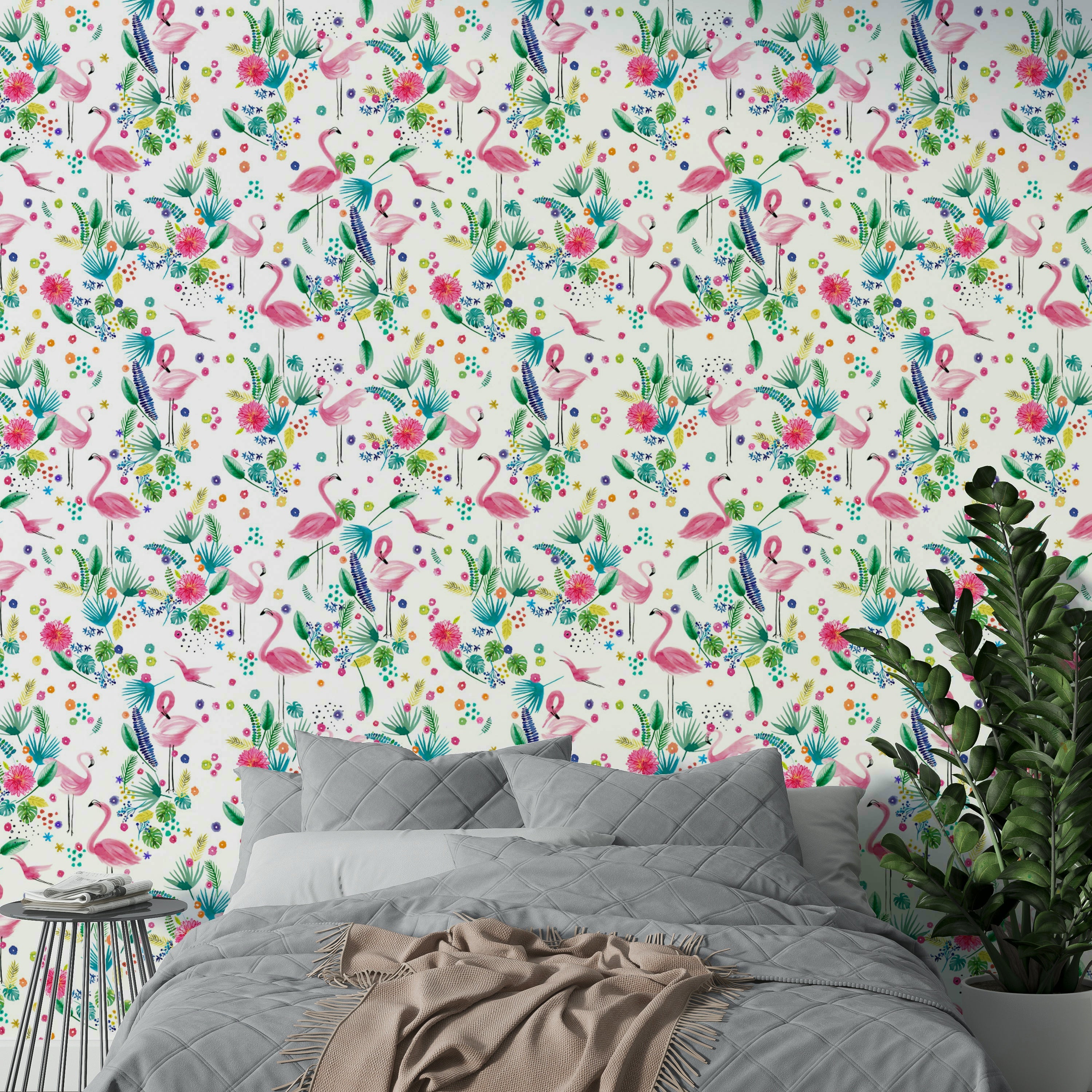 Escape to paradise with this vibrant wallpaper! A whimsical watercolor design features graceful pink flamingos amidst a lush jungle of vibrant green leaves and bright pink and orange flowers. The playful scattering of colorful dots and stylized floral elements adds a touch of whimsy and energy. Perfect for adding a cheerful, tropical flair to any space, this wallpaper evokes feelings of warmth, relaxation, and pure summer joy. Its bright, bold colors and eye-catching design will transform your room into a stunning tropical haven. The delicate watercolor style gives it a fresh, modern feel, making it a versatile choice for various interior styles.