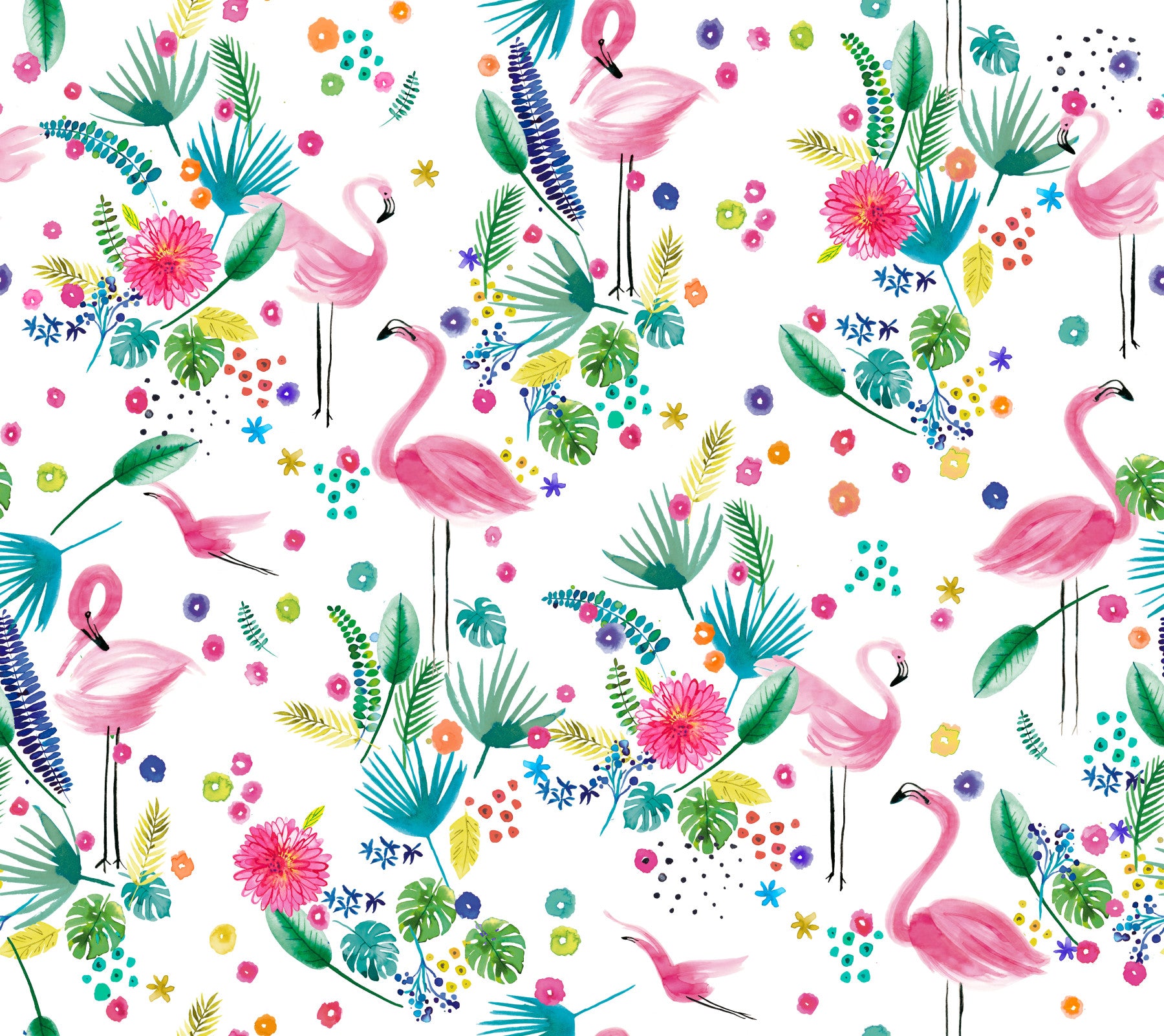 Hand-drawn tropical mural with flamingos and leafy greens.