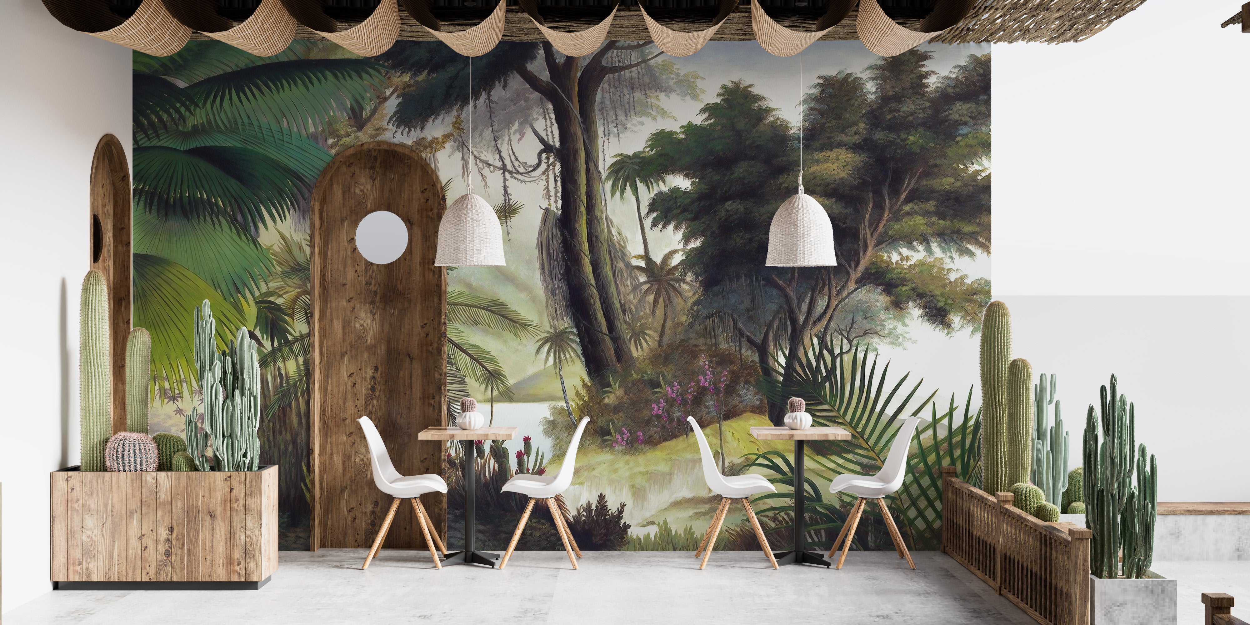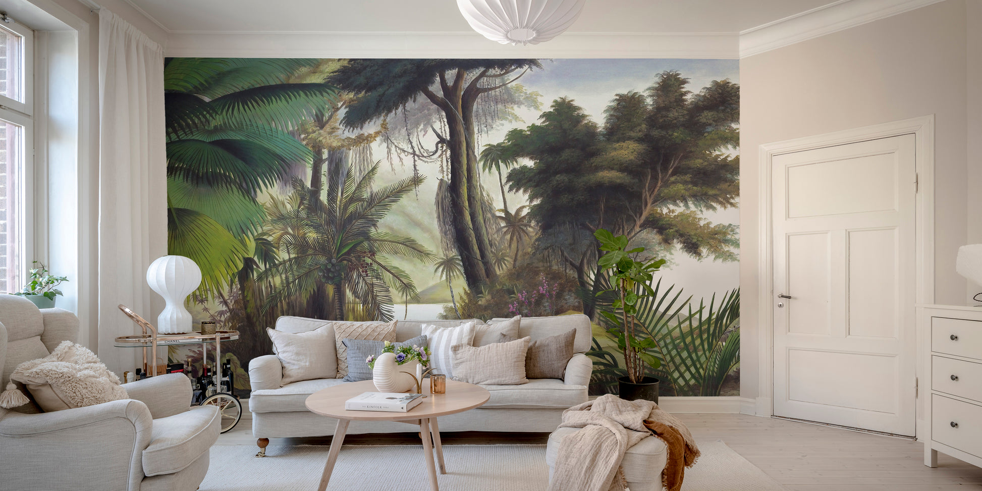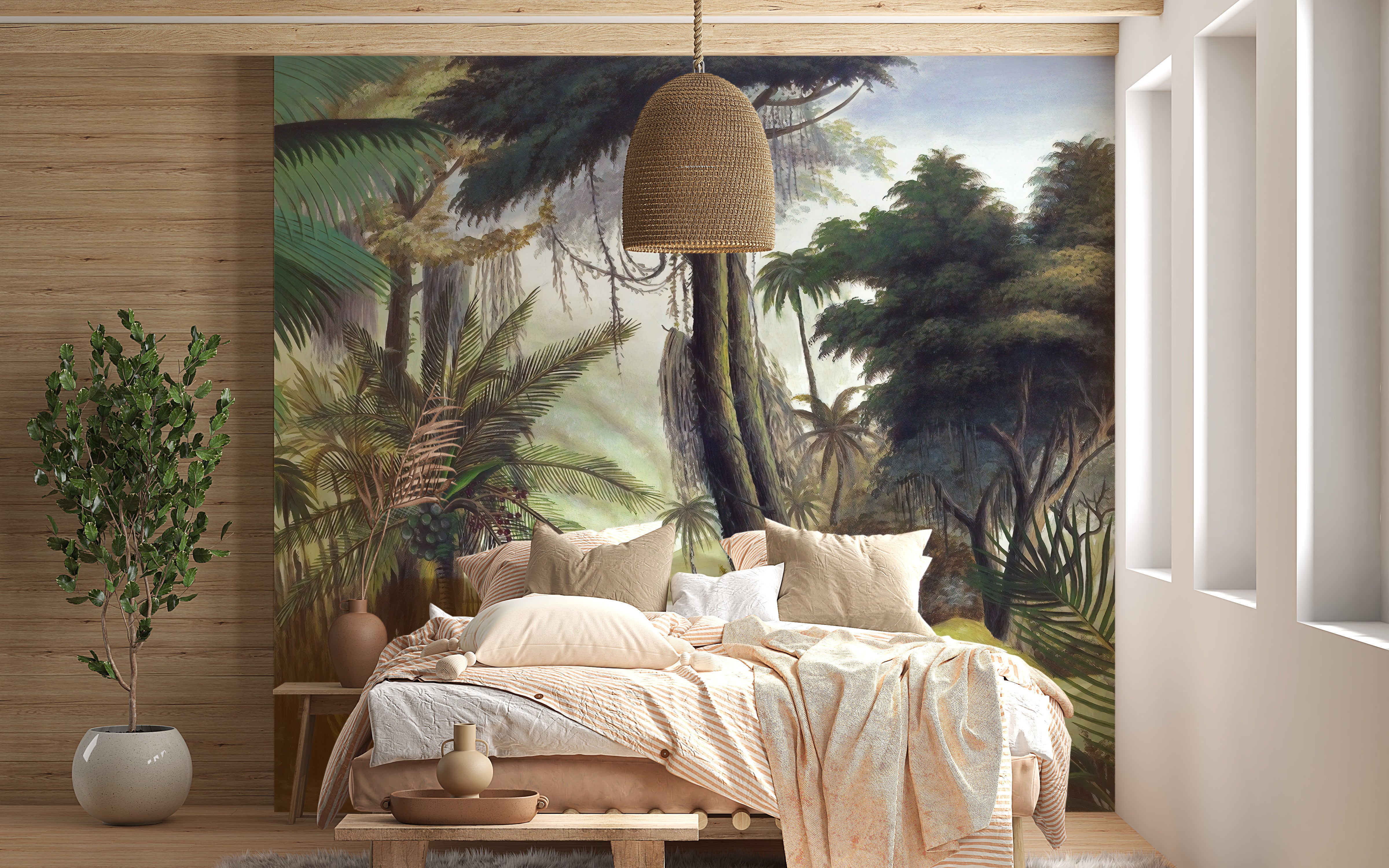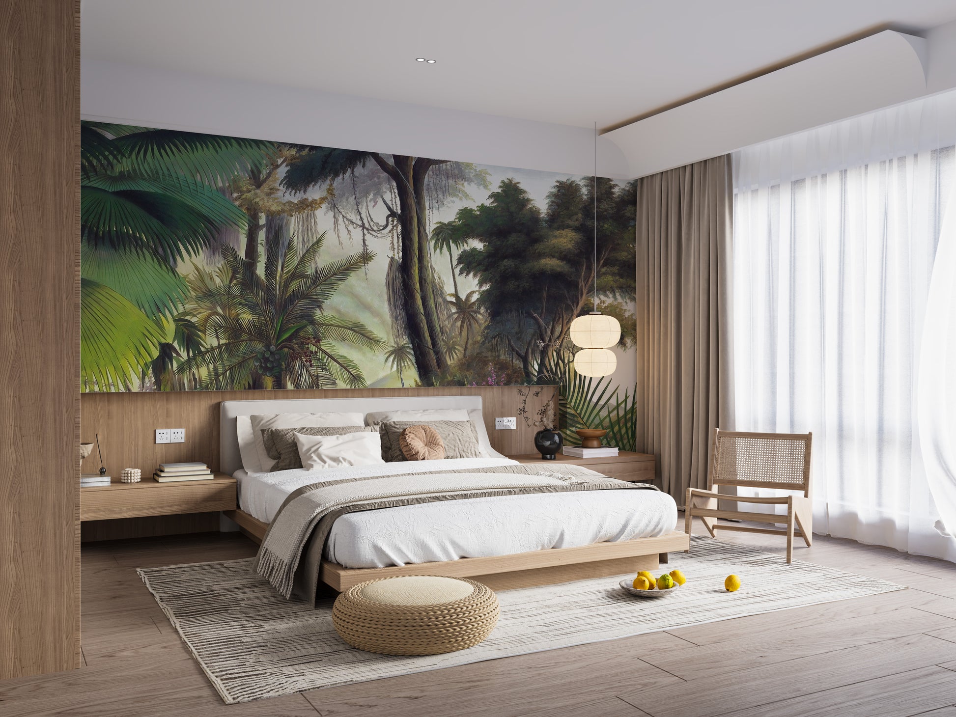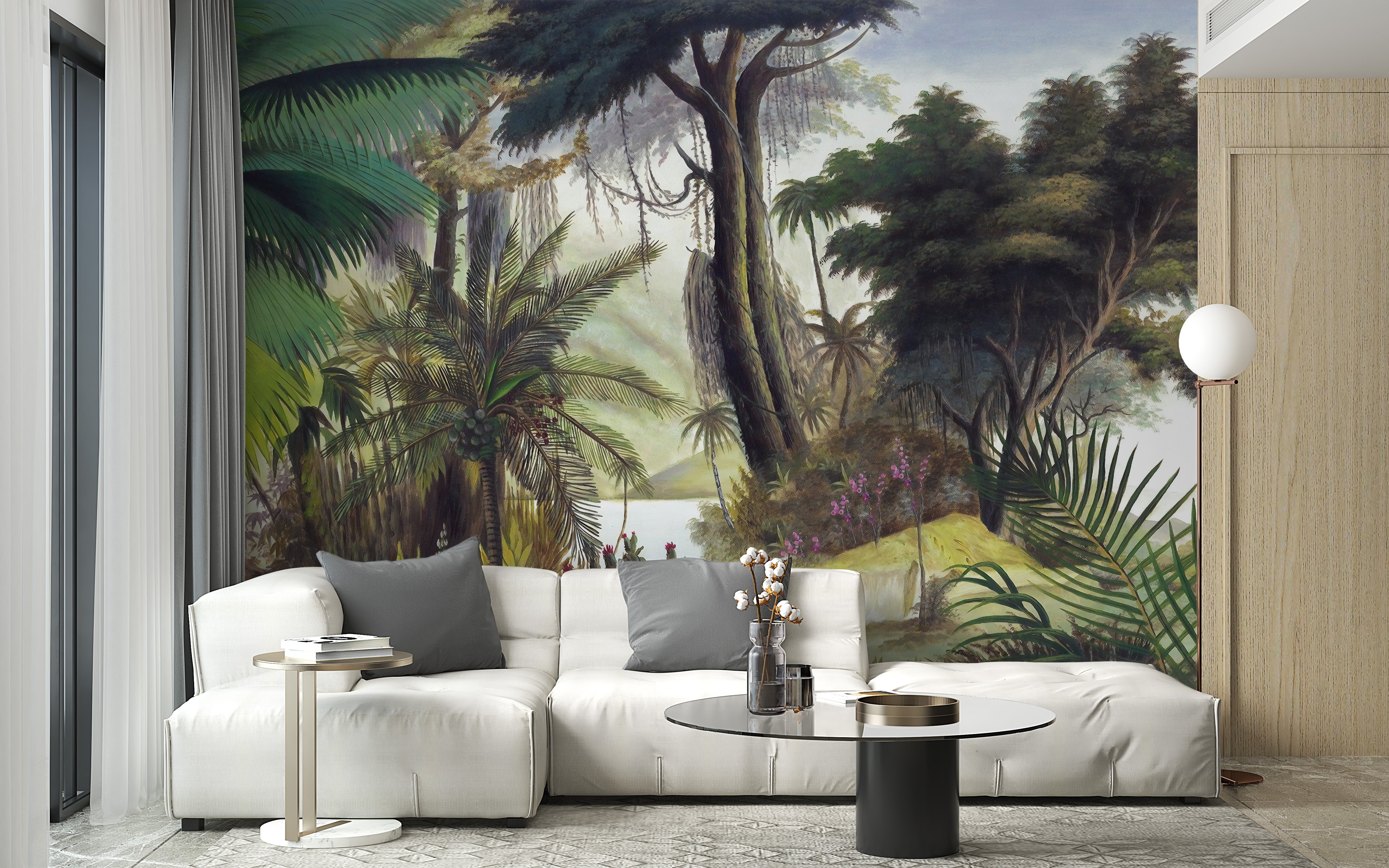Bring the serenity of the tropics to your living room with a beautiful foggy forest mural wallpaper. Let your space transport you to a lush jungle, where you can immerse yourself in the sounds of nature and escape the hustle and bustle of everyday life. Enjoy the intricacies of the forest, from tall trees and exotic birds to delicate foliage and misty fog. With this wallpaper, your iving room becomes a serene oasis where you can relax, unwind, and connect with the natural world. Upgrade your living space with this stunning wallpaper and enjoy the tranquil atmosphere it creates.