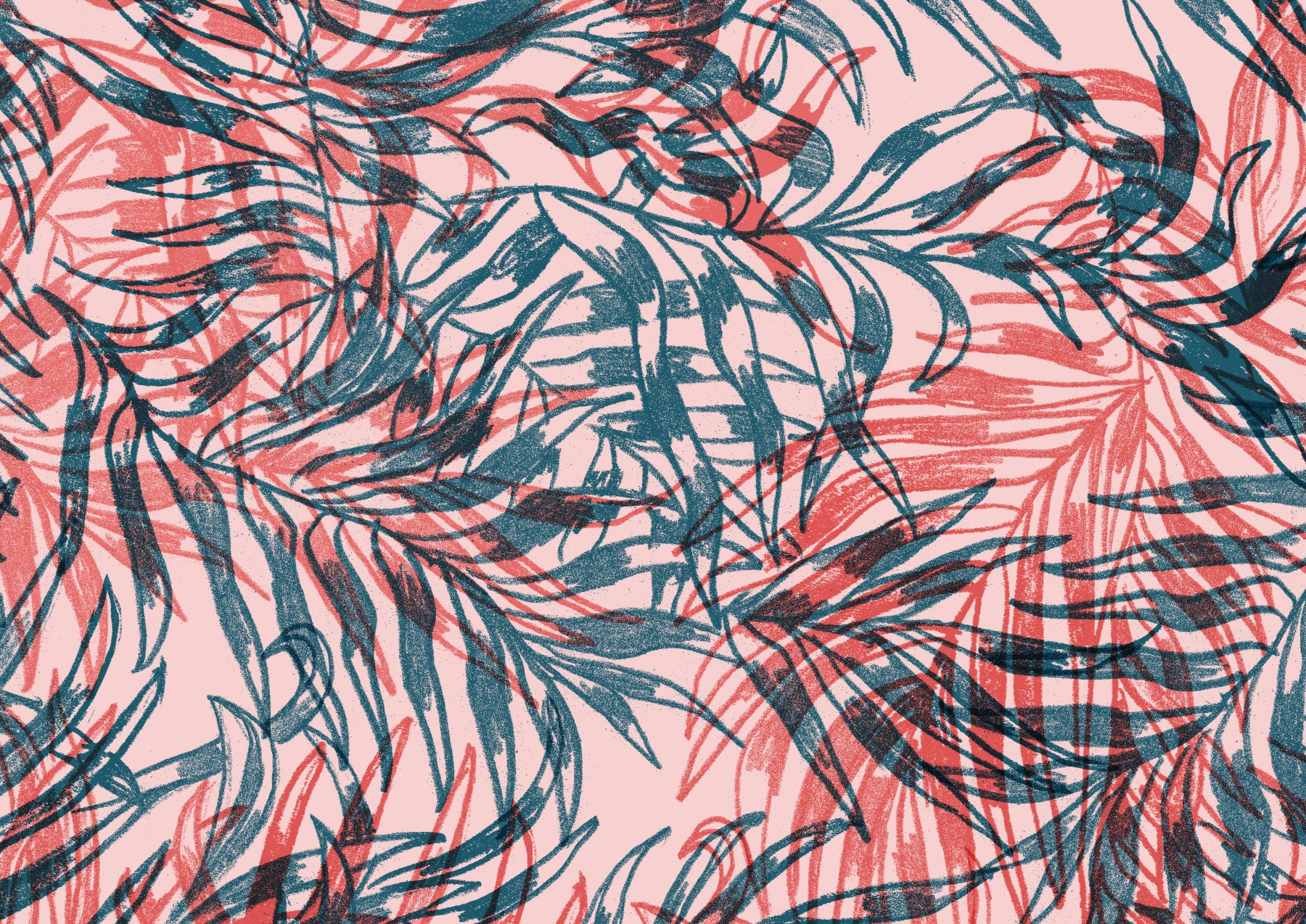 Introduce a vibrant touch with this distinctive wallpaper for walls, showcasing sketched tropical foliage. A muted pink background contrasts the overlapping layers of teal and red, adding a sense of depth. This design suits various interiors, from bedrooms to home offices, enhancing spaces with a blend of botanical inspiration and playful artistry. Its unique composition enlivens any space, adding an artistic twist to any interior decor.