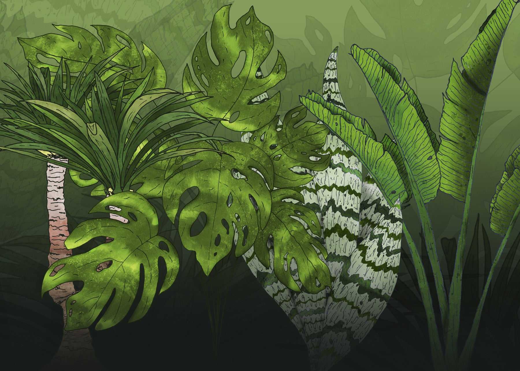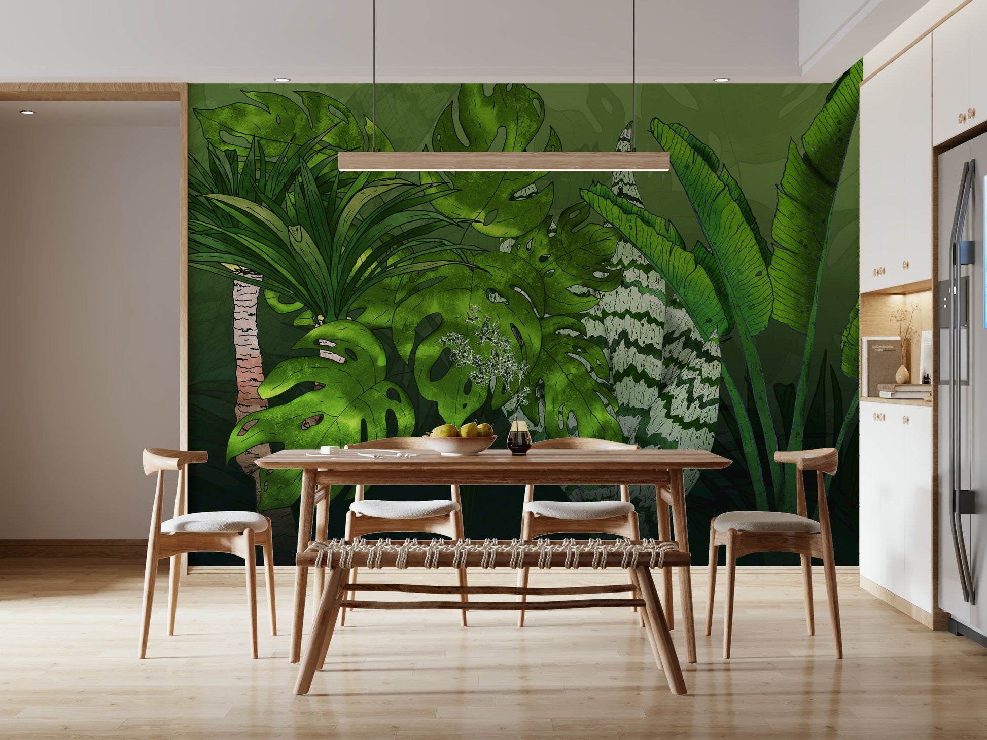 Transform any room into a tropical paradise with this inviting wallpaper for walls. The design bursts with various exotic foliage, highlighted in shades of green and soft browns. It creates a vibrant, immersive experience. This pattern is perfect for adding a touch of nature to a living room, bedroom, or even an office. The detailed and colourful illustration style beautifully enhances interiors. Imagine your space blooming with tropical charm and botanical beauty.
