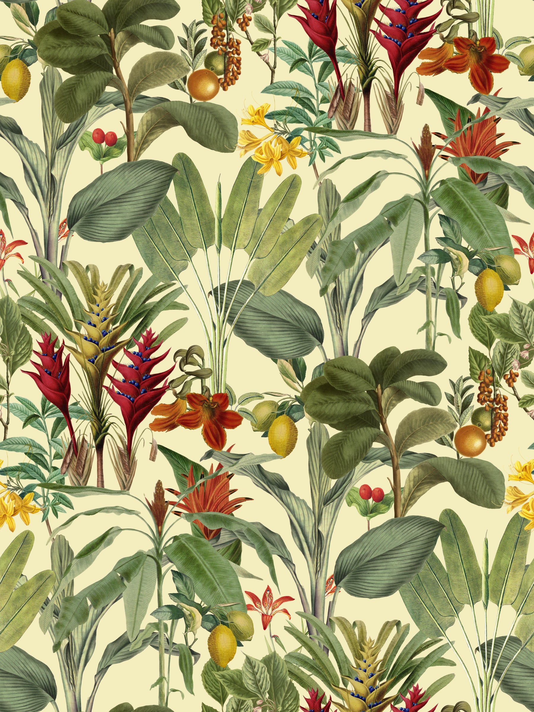 Tropical Jungle Garden Wallpaper captures the beauty of a lush botanical paradise with hand-illustrated leaves, fruits, and exotic flowers. Set on a soft cream base, it highlights vivid greens, warm yellows, deep reds, and citrus tones. The layered foliage and detailed flora create a bold yet classic jungle aesthetic perfect for dining areas, living rooms, or boutique spaces. This wallpaper turns any room into a vibrant tropical retreat while maintaining a vintage charm. Ideal for those who love detailed garden themes and a lively wall design that draws from both nature and nostalgia.