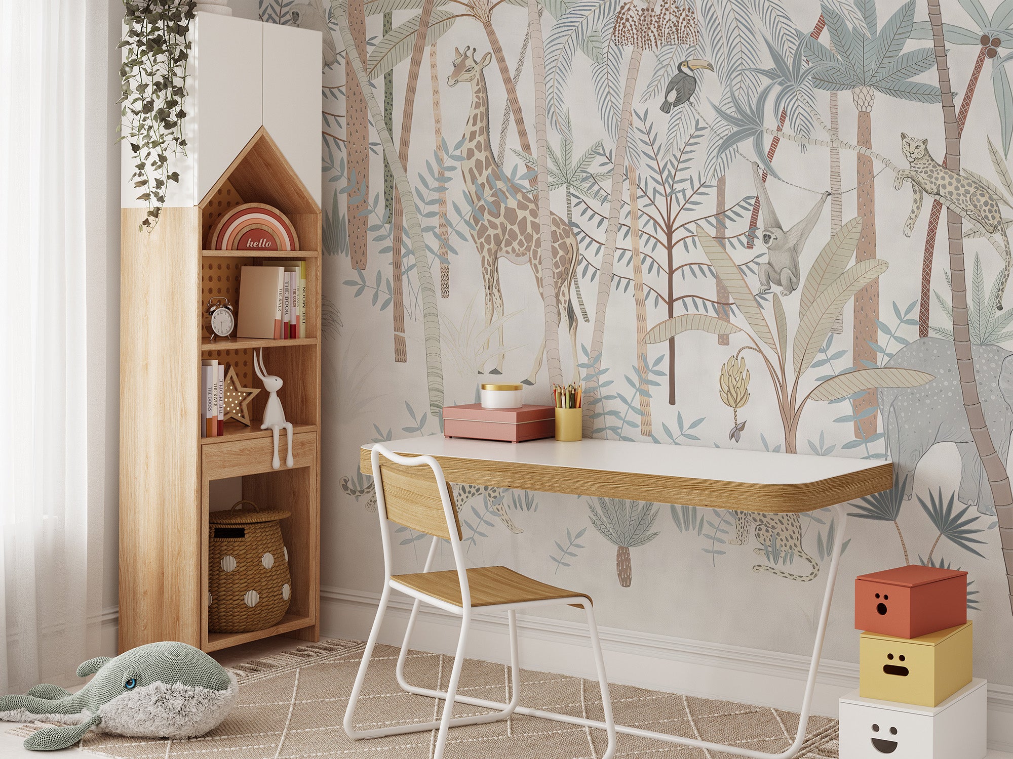 The tropical mirage fauna mural wraps a room in the enchantment of a lush wilderness. A perfect accompaniment for a child’s imagination, this nursery wallpaper invites young minds to explore a world brimming with gentle beasts and verdant flora. Each stroke celebrates nature's diverse tapestry, turning a simple wall into a storybook of adventure. This wallpaper serves as a backdrop for countless tales, where little eyes can wander from the majestic giraffe to the stealthy leopard. Safe, vivid inks breathe life into every creature, creating a nurturing haven for play and rest. Ideal for crafting a nurturing nook, this mural ensures the wildest of dreams bloom under its watchful, friendly fauna.