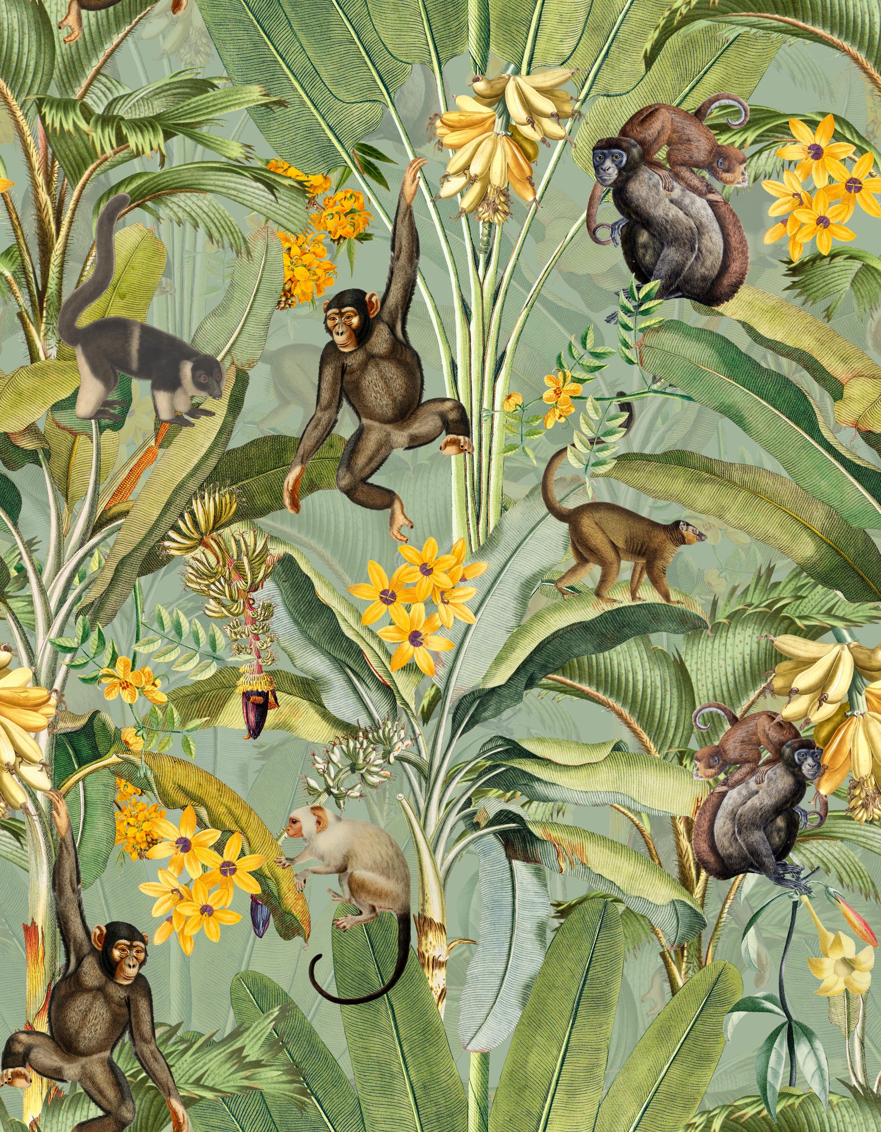 Jungle-inspired wallpaper featuring monkeys swinging through lush greenery.
