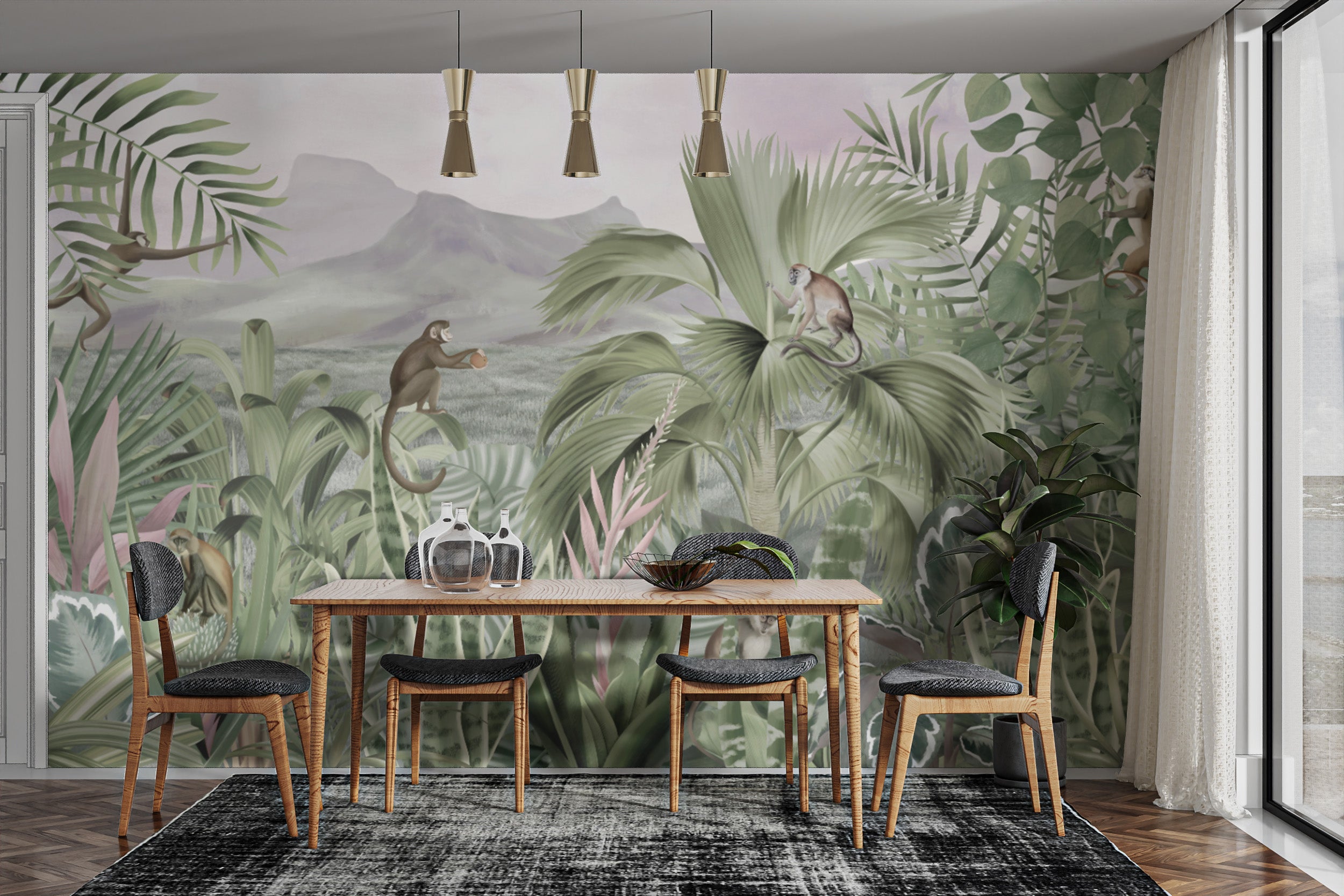 Green botanical jungle mural with playful monkeys