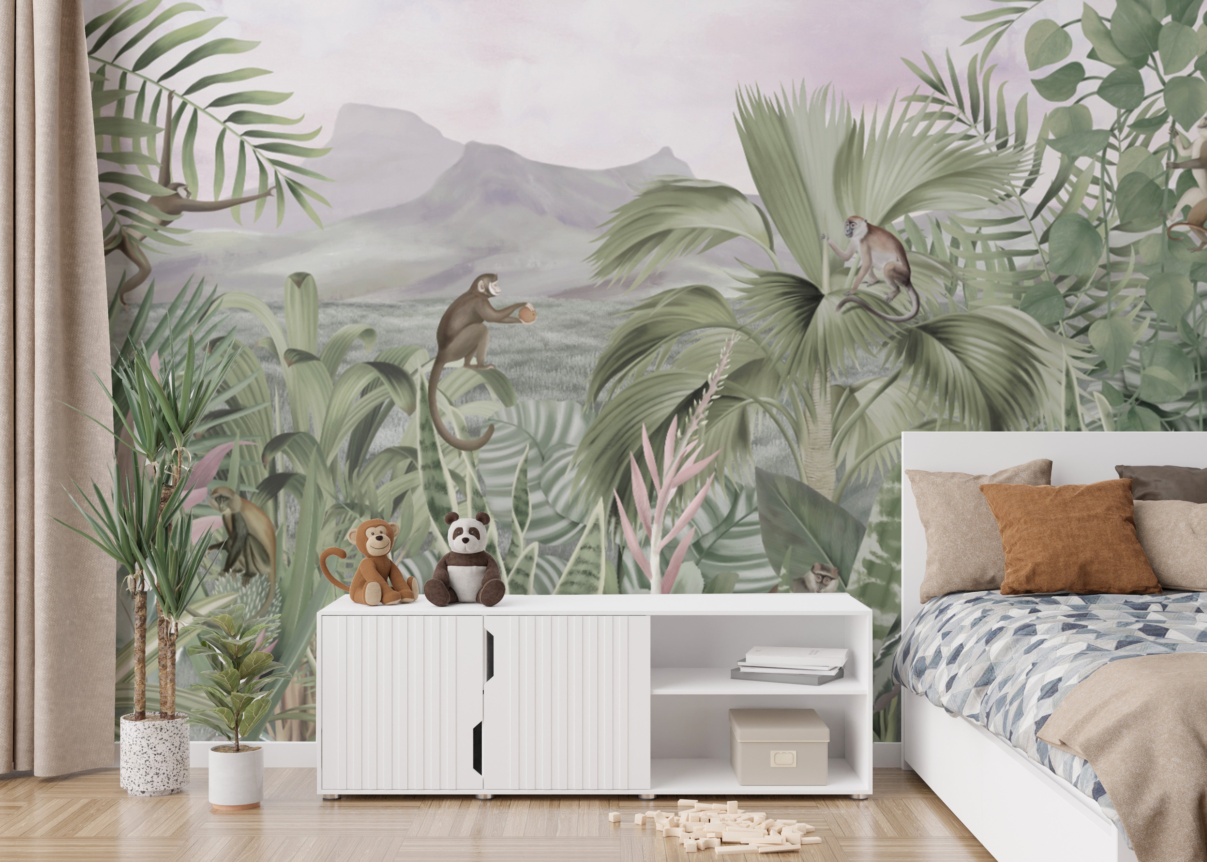 Monkey-themed jungle wallpaper for kids’ rooms