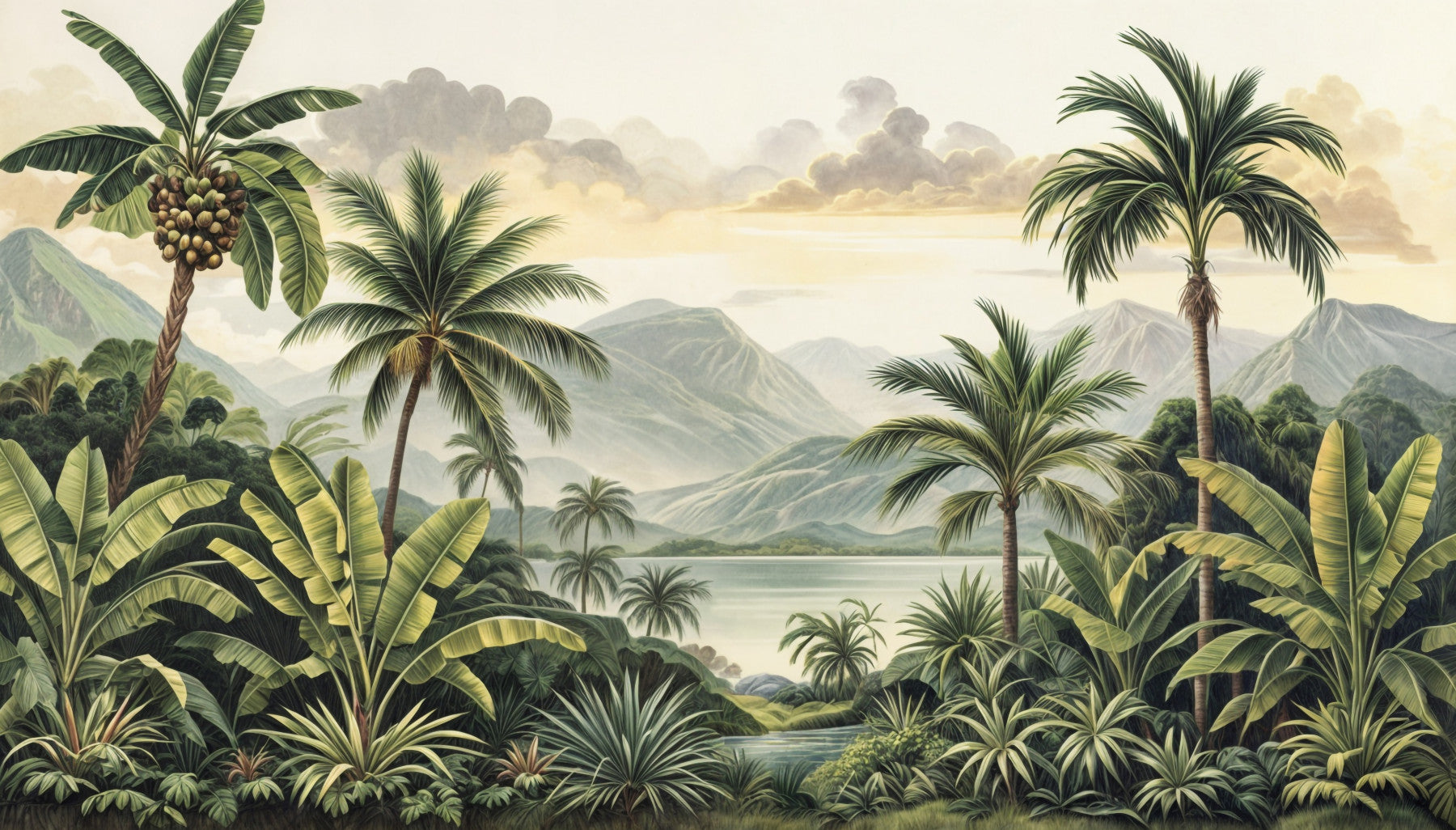 Escape to a tropical paradise with this scenic wallpaper. The design showcases vibrant green palm trees against a backdrop of misty mountains and a serene lake. This wallpaper for walls creates a relaxed and inviting atmosphere in any room. The combination of lush foliage and soft, muted colors makes it perfect for a living room, dining room, or even a bathroom, bringing a touch of nature indoors.