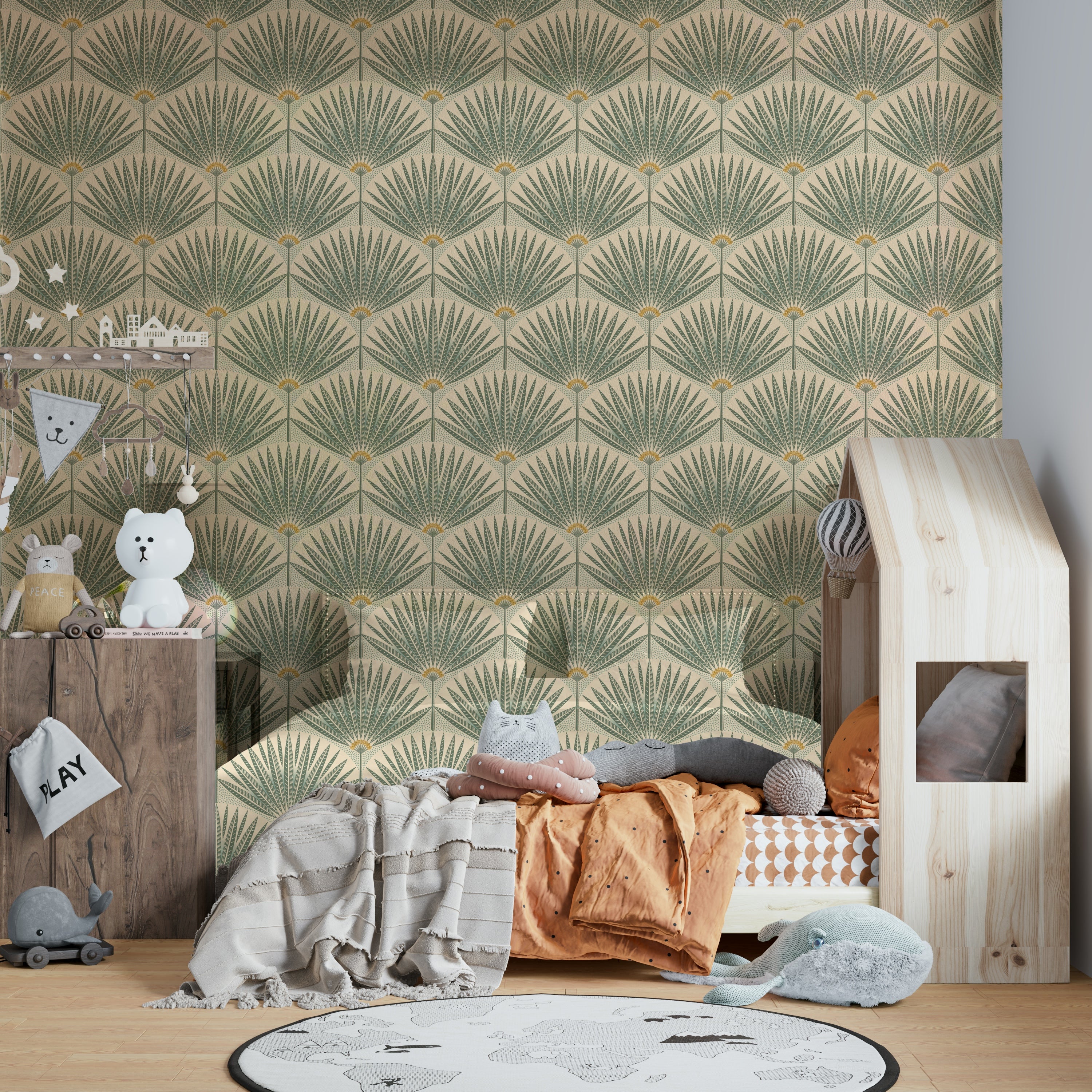 Escape to a tranquil tropical paradise with this wallpaper featuring a lush, stylized palm leaf pattern. The soft, muted color palette of sage greens and creams evokes a sense of peace and relaxation. The carefully balanced design creates a seamless and visually appealing pattern that effortlessly enhances any room. Whether used in a bedroom, living room, or home office, this wallpaper brings a touch of the tropics to your home, transforming your space into a calming sanctuary.