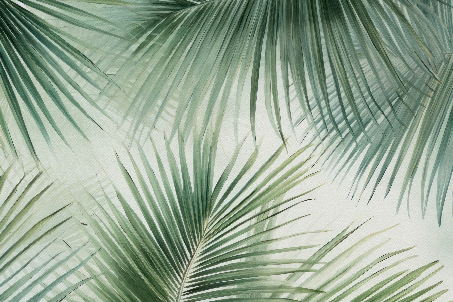 Escape to paradise with this vibrant tropical wallpaper. The design features lush, stylized palm leaves in a range of soft, natural greens against a subtle off-white background. The artistic rendering, reminiscent of a watercolor painting, creates a sense of airy lightness and tranquility. This wallpaper is perfect for adding a touch of relaxed sophistication to any room, from bedrooms and living spaces to offices seeking a calming atmosphere. The delicate detail and organic forms are captivating, offering a visual escape to sun-drenched shores and tranquil getaways.