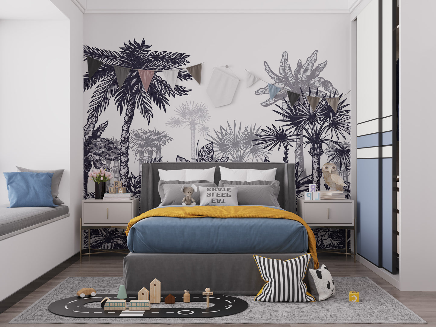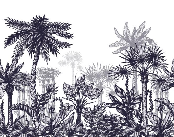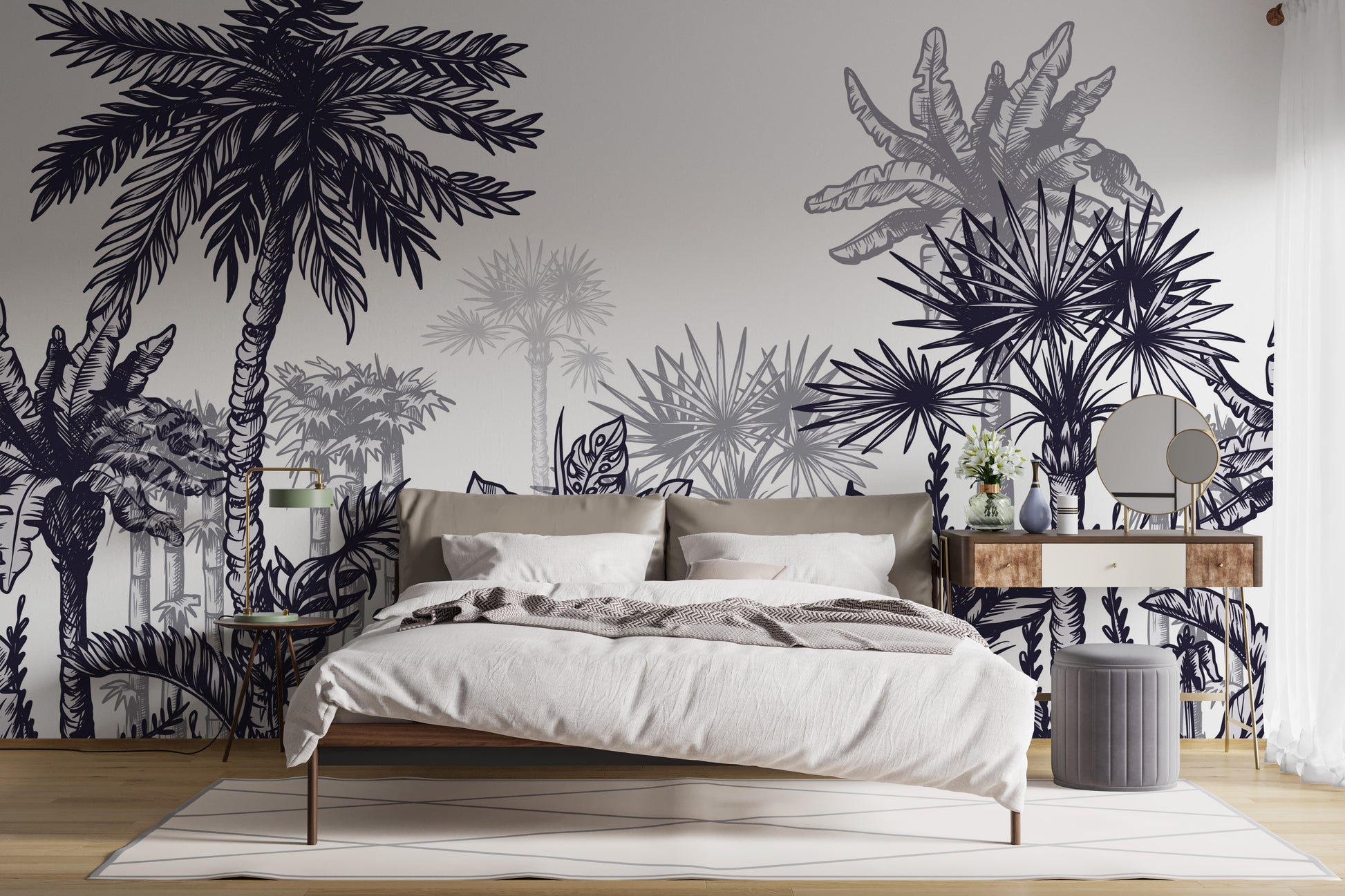Escape to a serene paradise with our large sized tropical tree wallpaper mural. Transform your space into a tranquil haven with this stunning piece, featuring a lush array of tropical trees including palm, coconut, and monstera, all set against a crisp white background. Crafted with exquisite attention to detail, the dark silhouettes provide a striking contrast that captivates and soothes the soul.