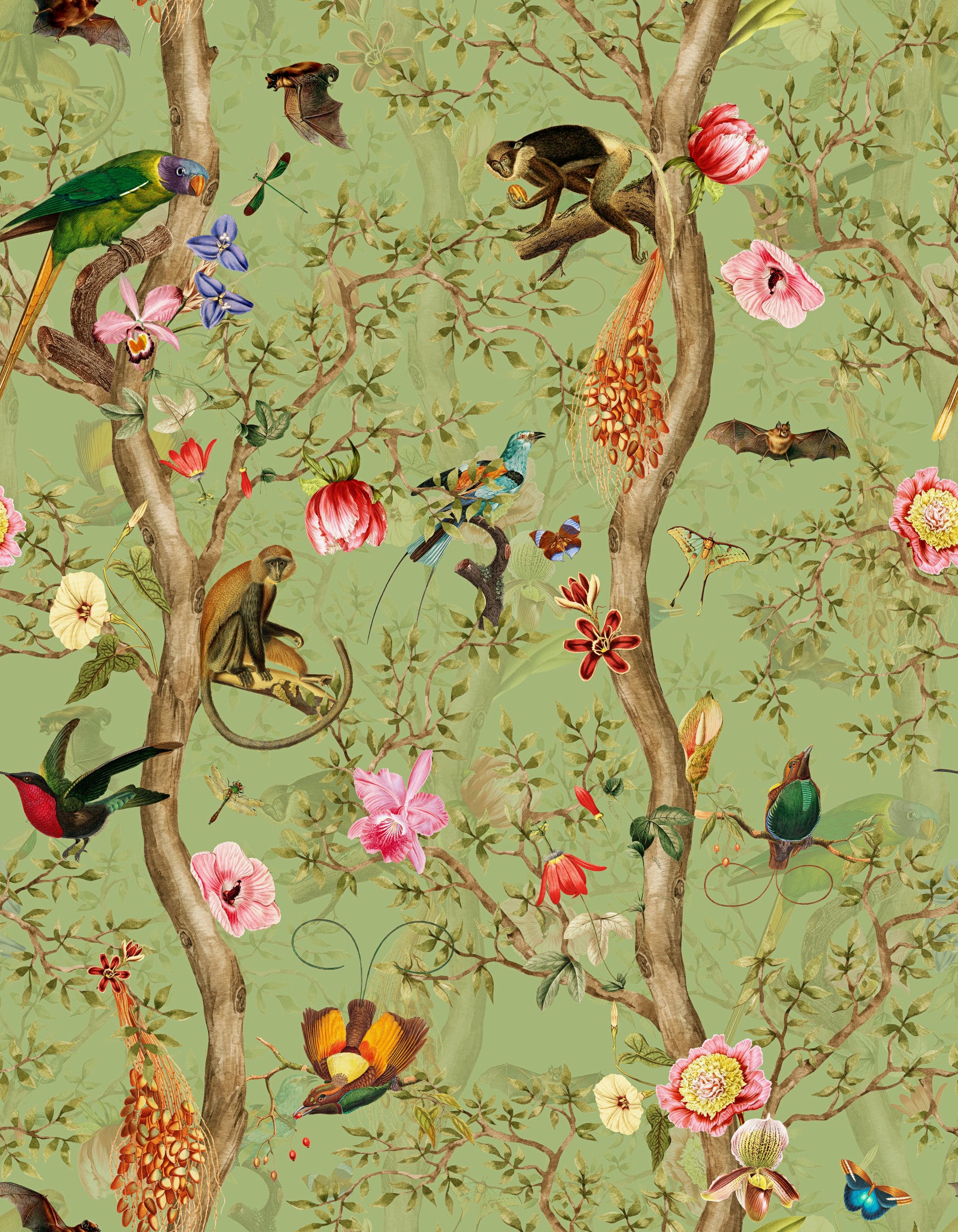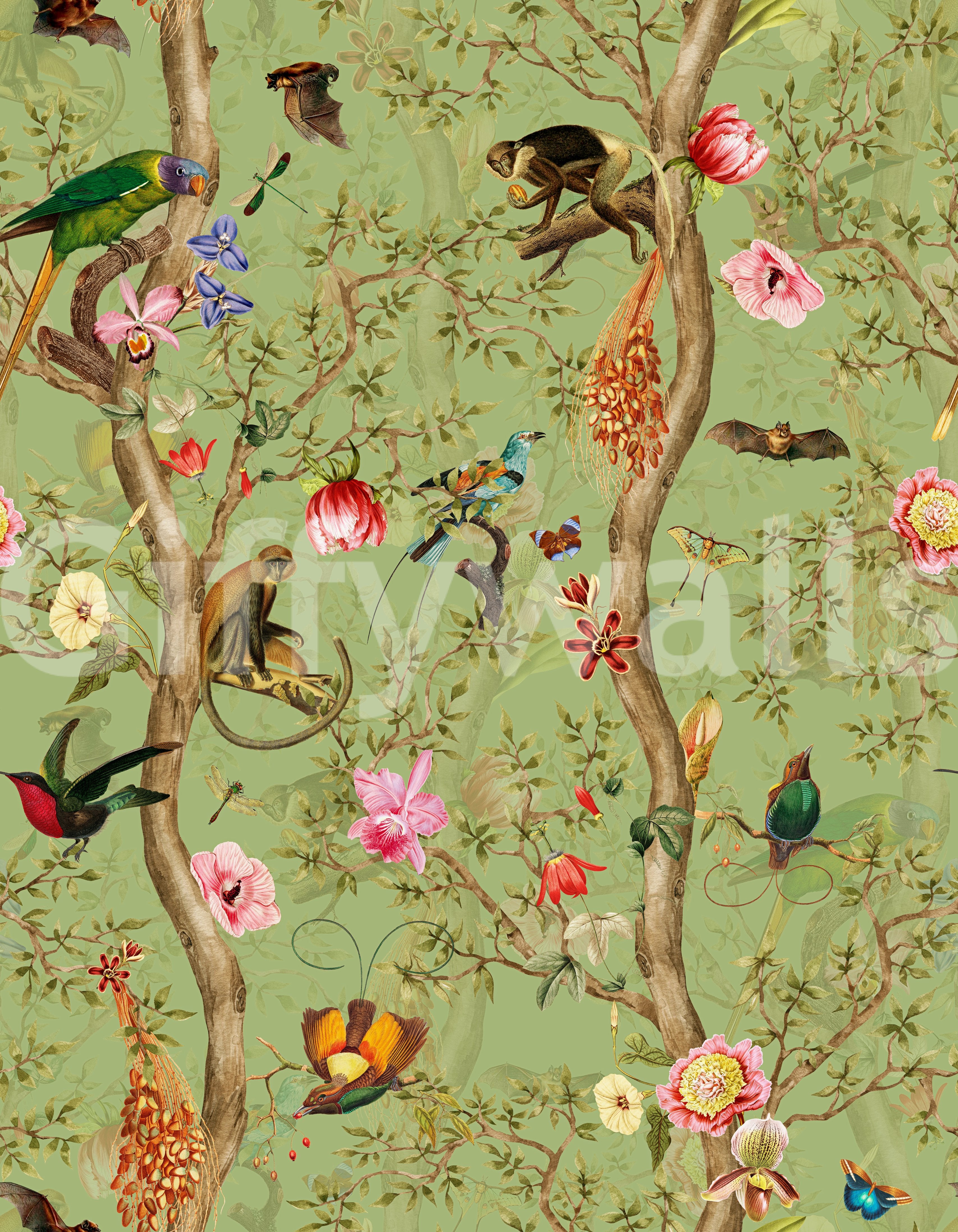 Tropical Paradise Birds 4 Wallpaper brings the rainforest to life with vivid detail and playful charm. Birds, butterflies, monkeys, and tropical flowers dance across twisting trees on a soft green backdrop. Ideal for artistic homes, kids' rooms, or creative studios, this mural wallpaper adds energy without noise. Every glance reveals new details—birds in flight, blossoms in bloom, and life between branches. It’s printed on high-quality material for long-lasting impact and easy application. A true wall mural for nature lovers, this wallpaper for walls is the perfect choice for interiors that love color, curiosity, and a hint of the wild.