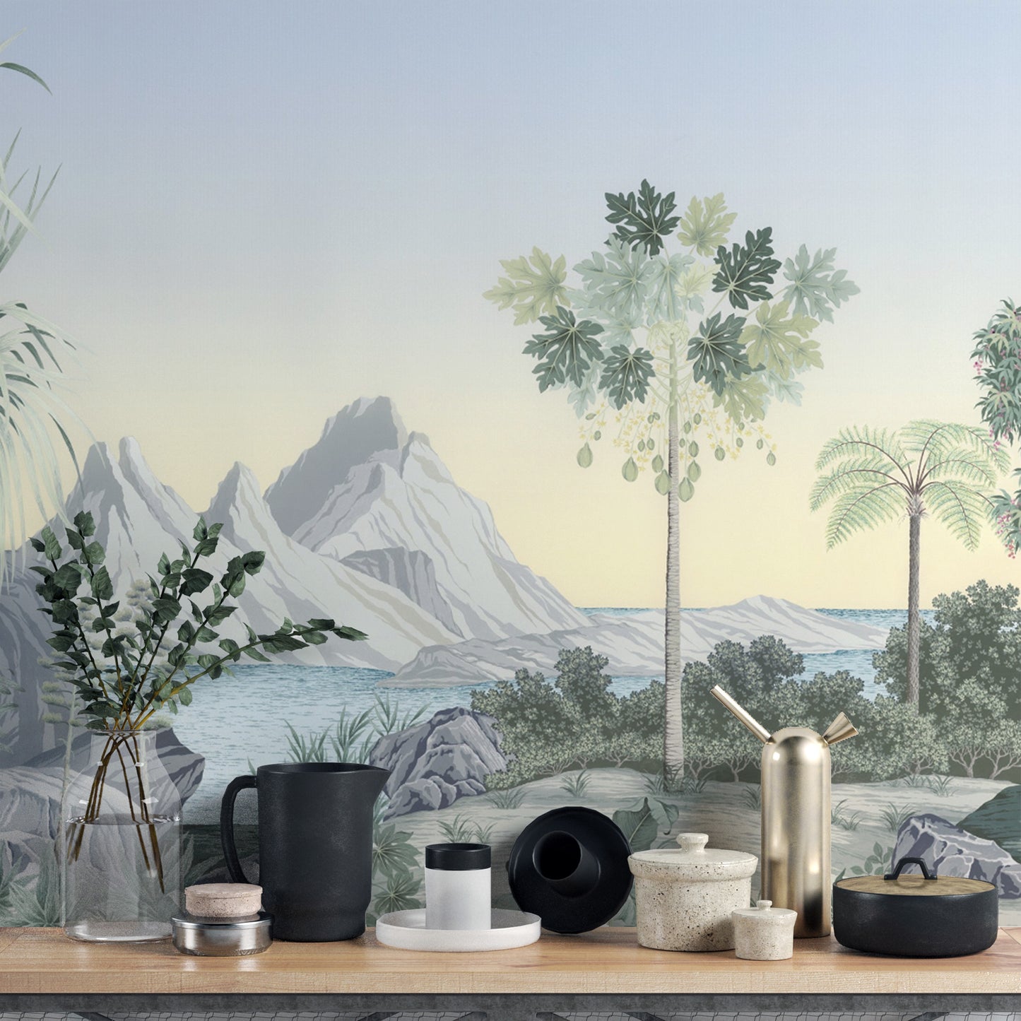 Exotic landscape wallpaper with trees, rocks, and mountains