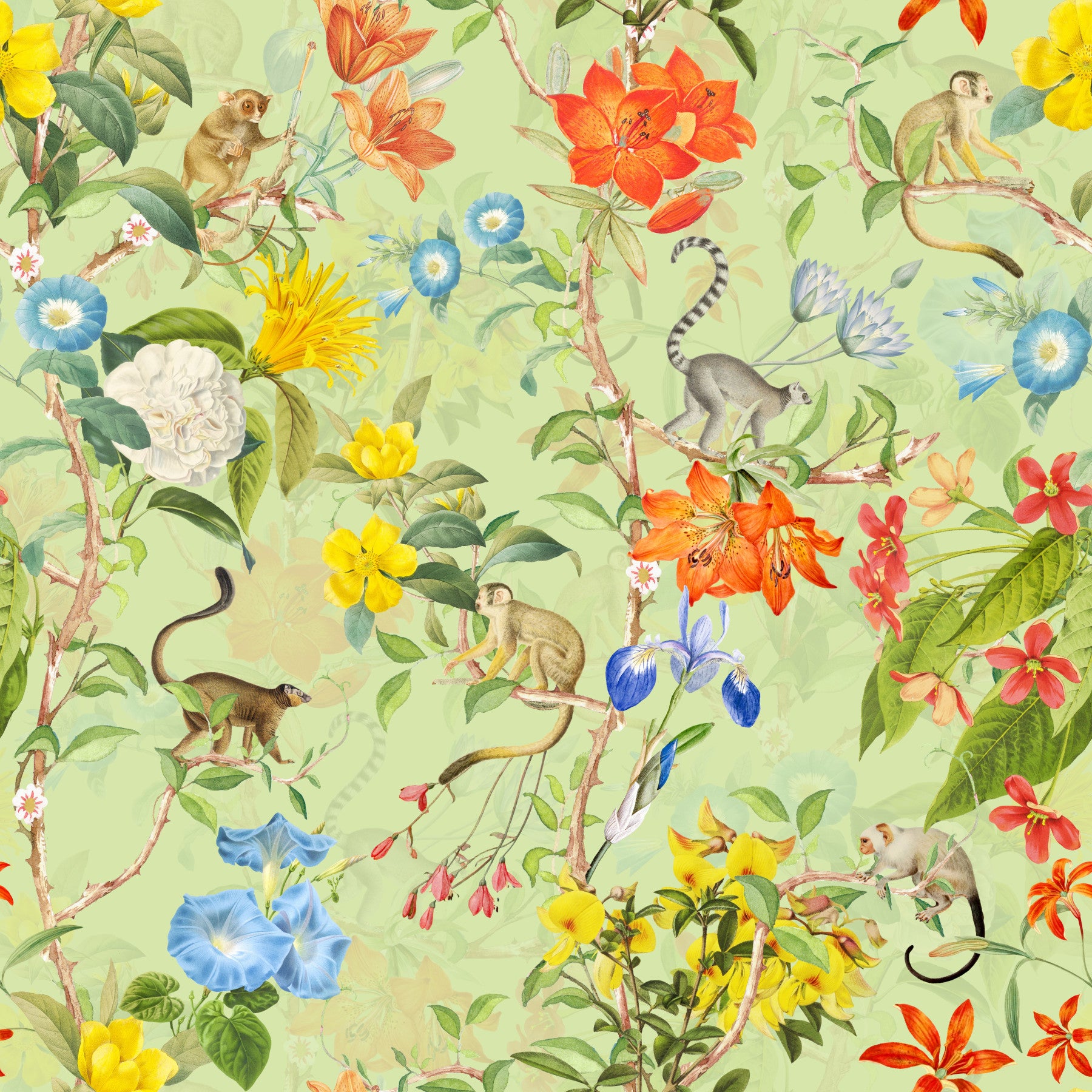 Escape to a 'Tropical Paradise' with this exquisite wallpaper. A seamless blend of vibrant flora and fauna, the design showcases a breathtaking array of tropical flowers and playful monkeys in a charming vintage style. Delicate watercolor brushstrokes bring to life the rich colors of lilies, morning glories, and yellow blossoms against a soft, pale green background. The intricate detail of each flower and the lively monkeys create a lively yet serene atmosphere, perfect for adding a touch of exotic elegance to any room. This wallpaper is a feast for the eyes, a visual journey to a sun-drenched haven.