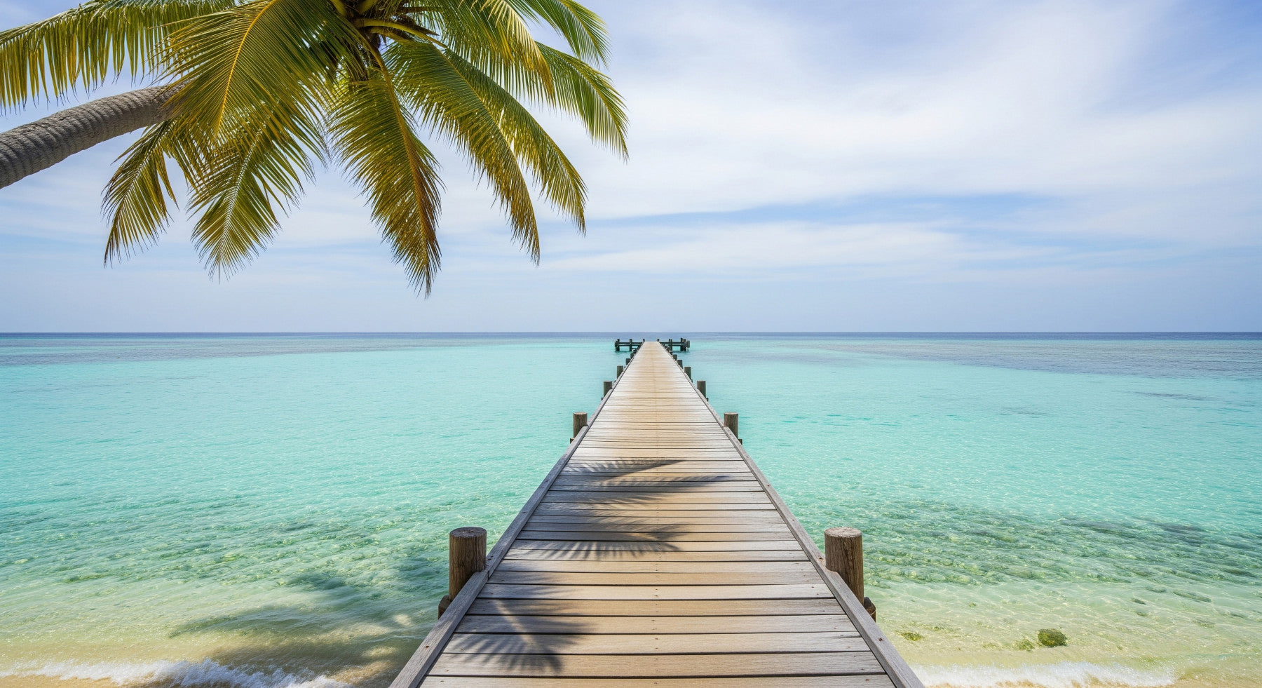 Tropical Pier Wall Mural in bedroom, wooden boardwalk to sea, soft sky colors, calm backdrop