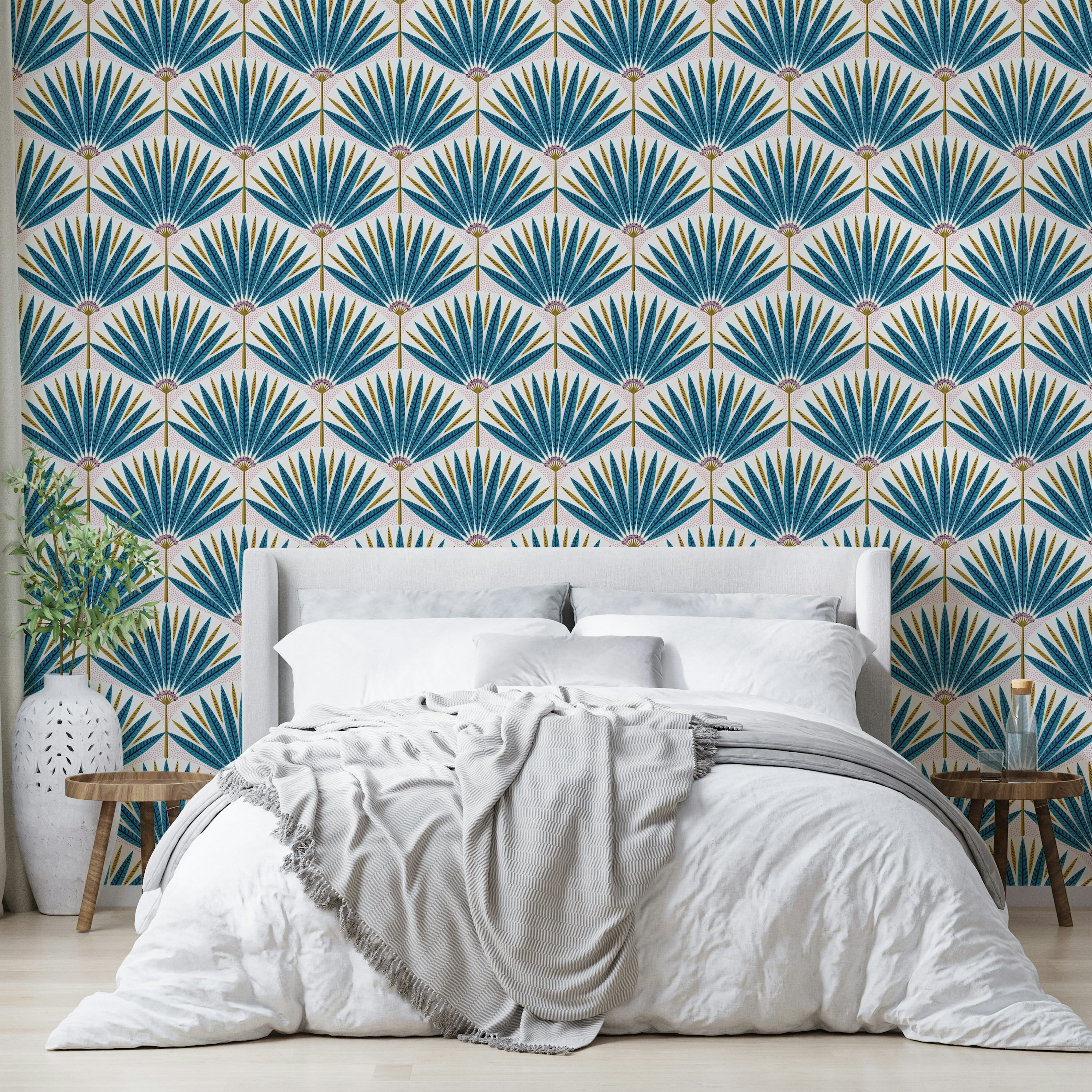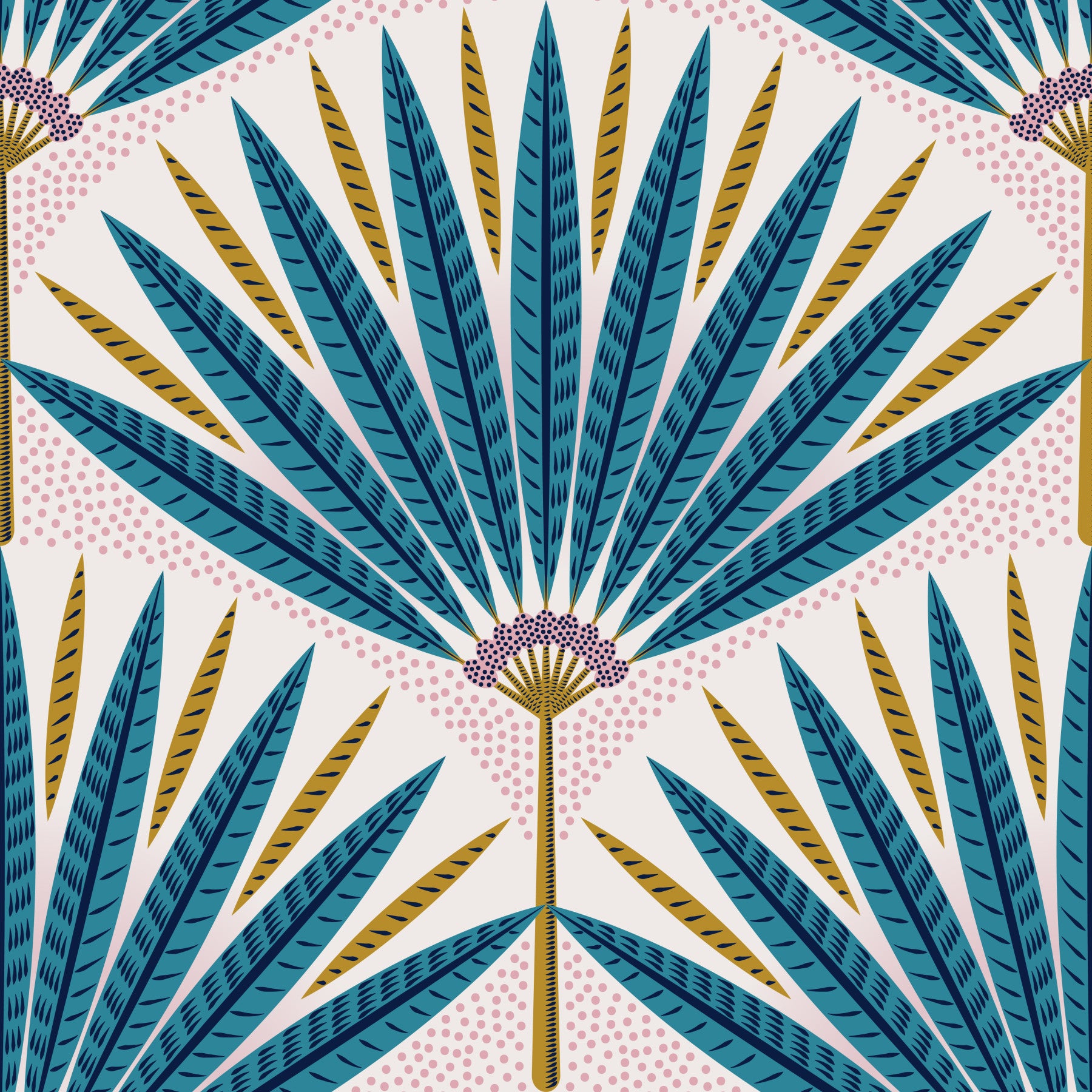 Escape to the tropics with 'Tropical Radiance,' a vibrant wallpaper boasting a bold pattern of stylized teal and gold leaves. The design's geometric yet organic feel creates a captivating visual rhythm, lending a touch of both modern elegance and exotic flair to any room. The subtle interplay of pink dots and the off-white background ensures the design remains balanced and visually appealing, while the repeating pattern adds a seamless touch. Perfect for adding a touch of the tropics to modern or eclectic interiors.