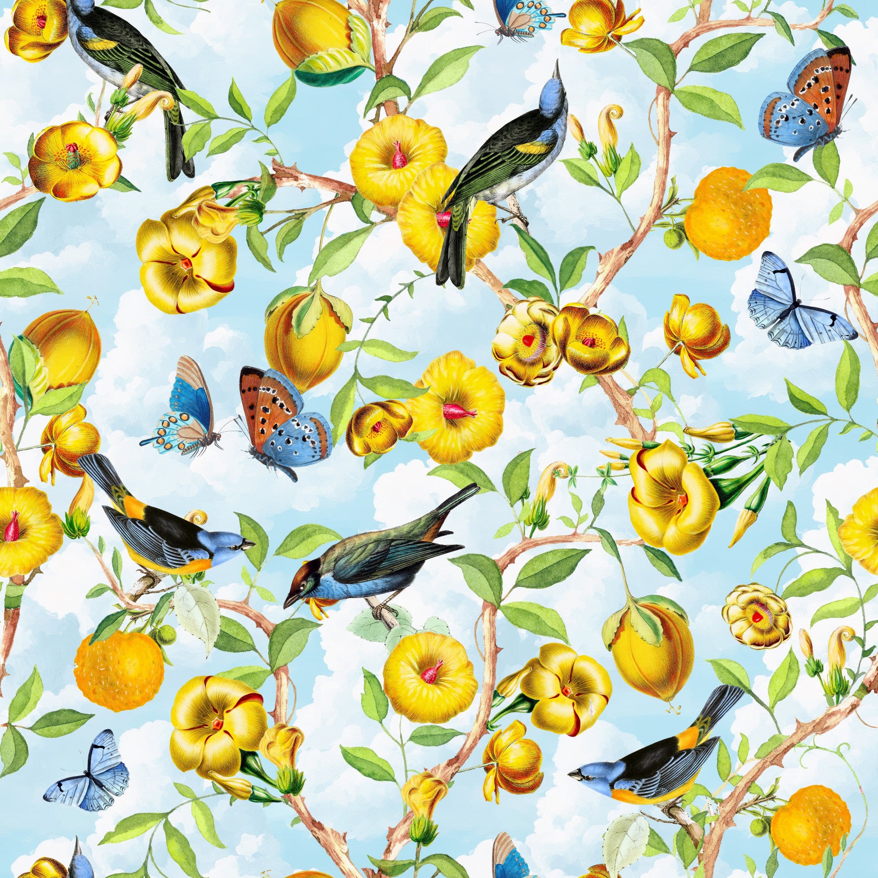 Escape to a vibrant tropical paradise with this stunning wallpaper. Rich yellow flowers burst forth, intertwined with lush green foliage, creating a lively and energetic scene. Colorful birds perch gracefully amidst the blooms, adding a touch of exotic charm. The watercolor style adds a soft, delicate quality to the bold colors, perfectly balancing vibrancy and serenity. Bring the warmth and beauty of the tropics into your home with this captivating design.