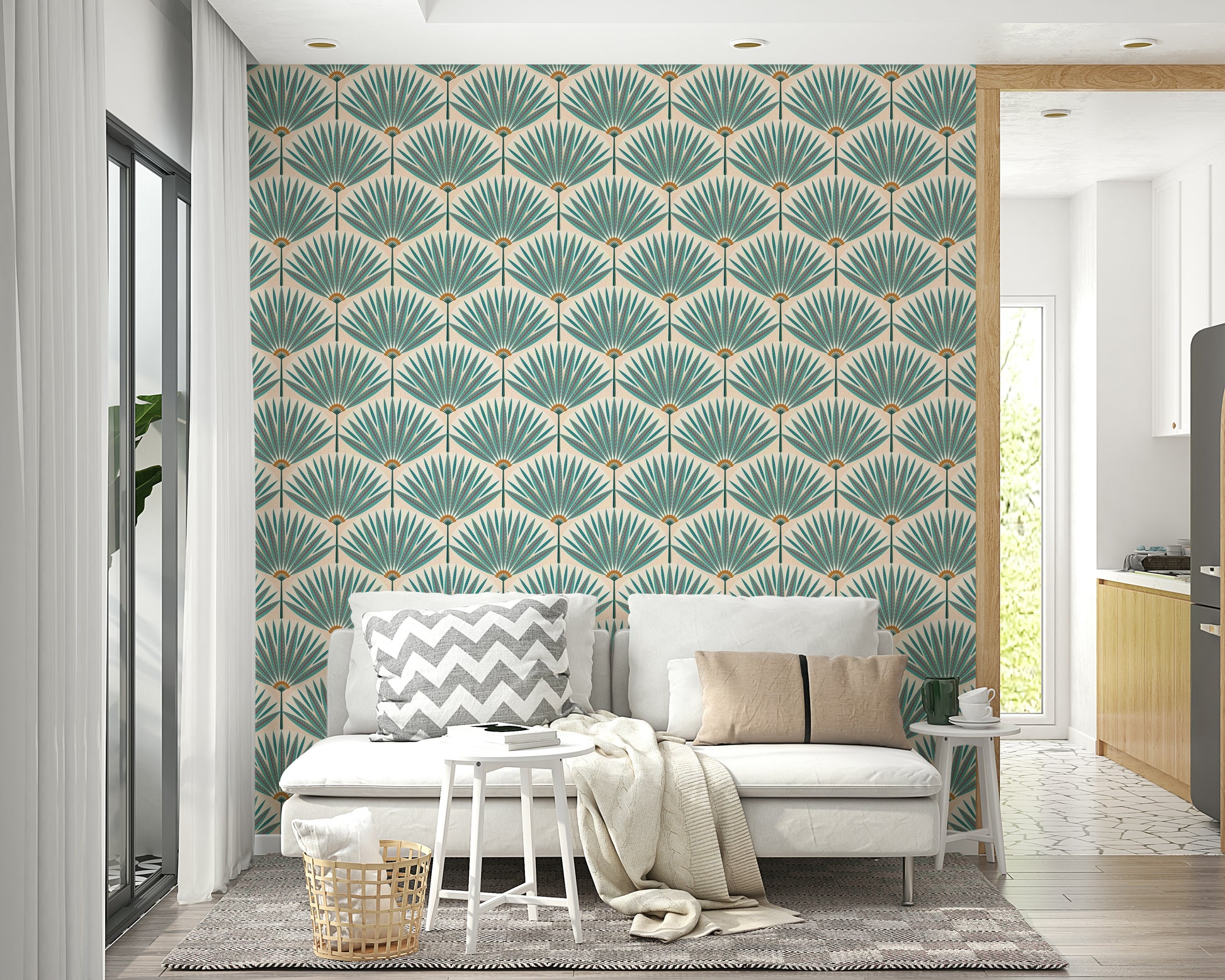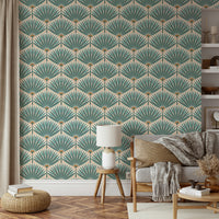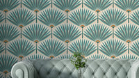 Immerse yourself in a vibrant tropical escape with this wallpaper. The design features stylized teal and burgundy palm leaves arranged in a symmetrical, almost art deco pattern, creating a sense of calm yet energetic sophistication. The subtle peachy-beige background adds a soft touch, while the dotted texture provides a playful contrast. This wallpaper is perfect for adding a touch of exotic elegance to any room in your home, from the living room to a tranquil bedroom.