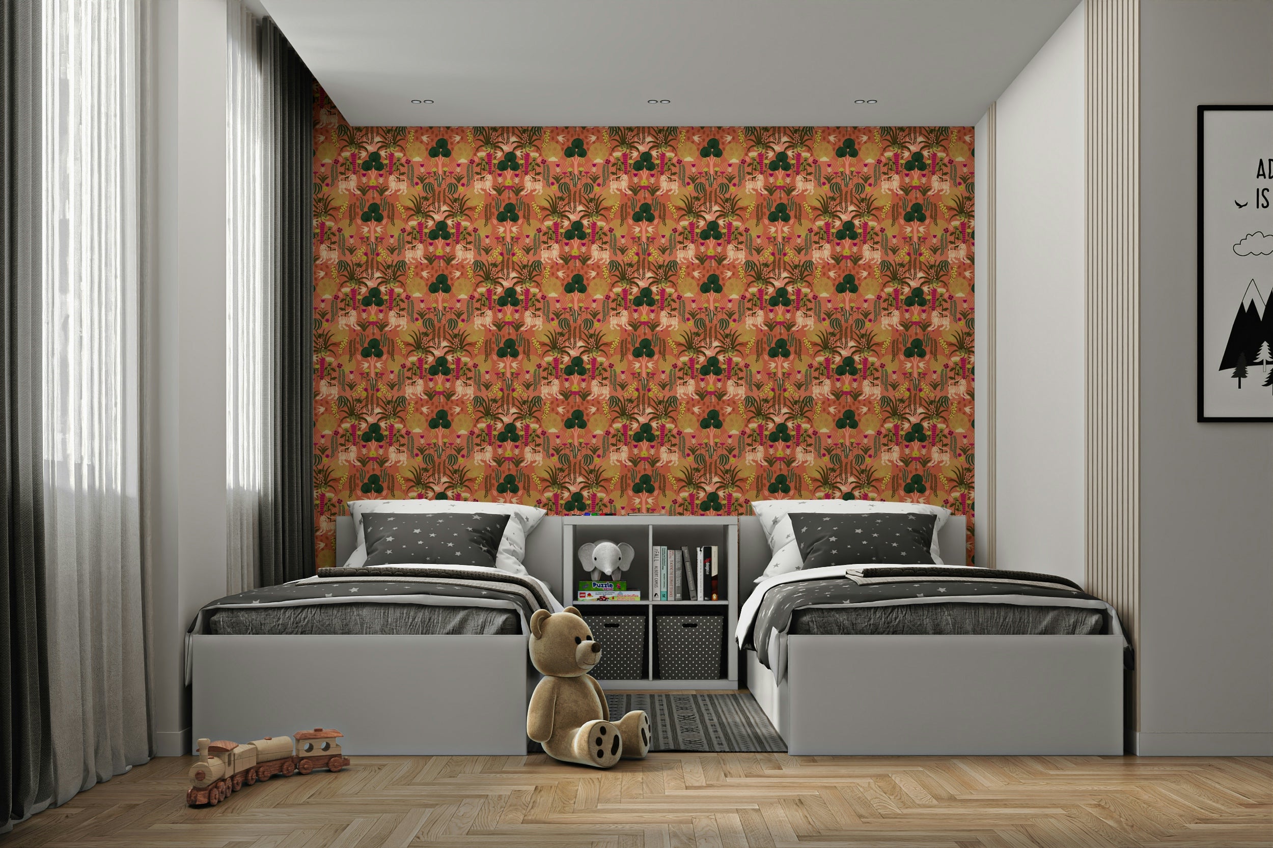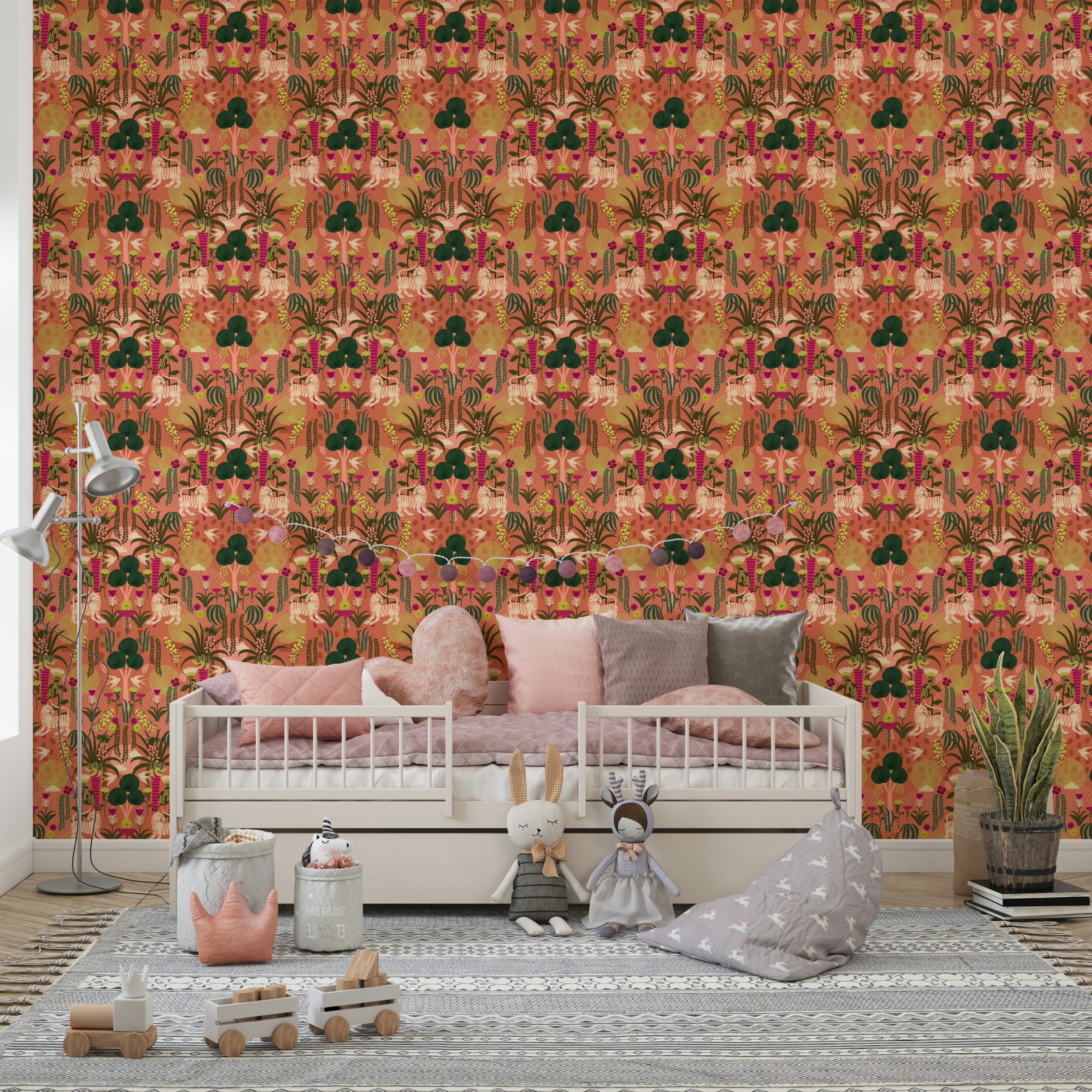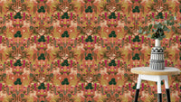 Escape to a vibrant paradise with "Tropical Tiger Garden." This wallpaper transports you to a lush, stylized jungle brimming with life. Striking orange tigers gracefully roam amidst a profusion of exotic flowers in bold hues of pink, purple, and yellow. Playful monkeys swing from vibrant, banana-laden palm trees, while delicate birds flit between the foliage. The overall design is a sophisticated blend of organic and geometric shapes, creating a captivating and harmonious scene that is both playful and elegant. Perfect for adding a touch of wild sophistication to any space.
