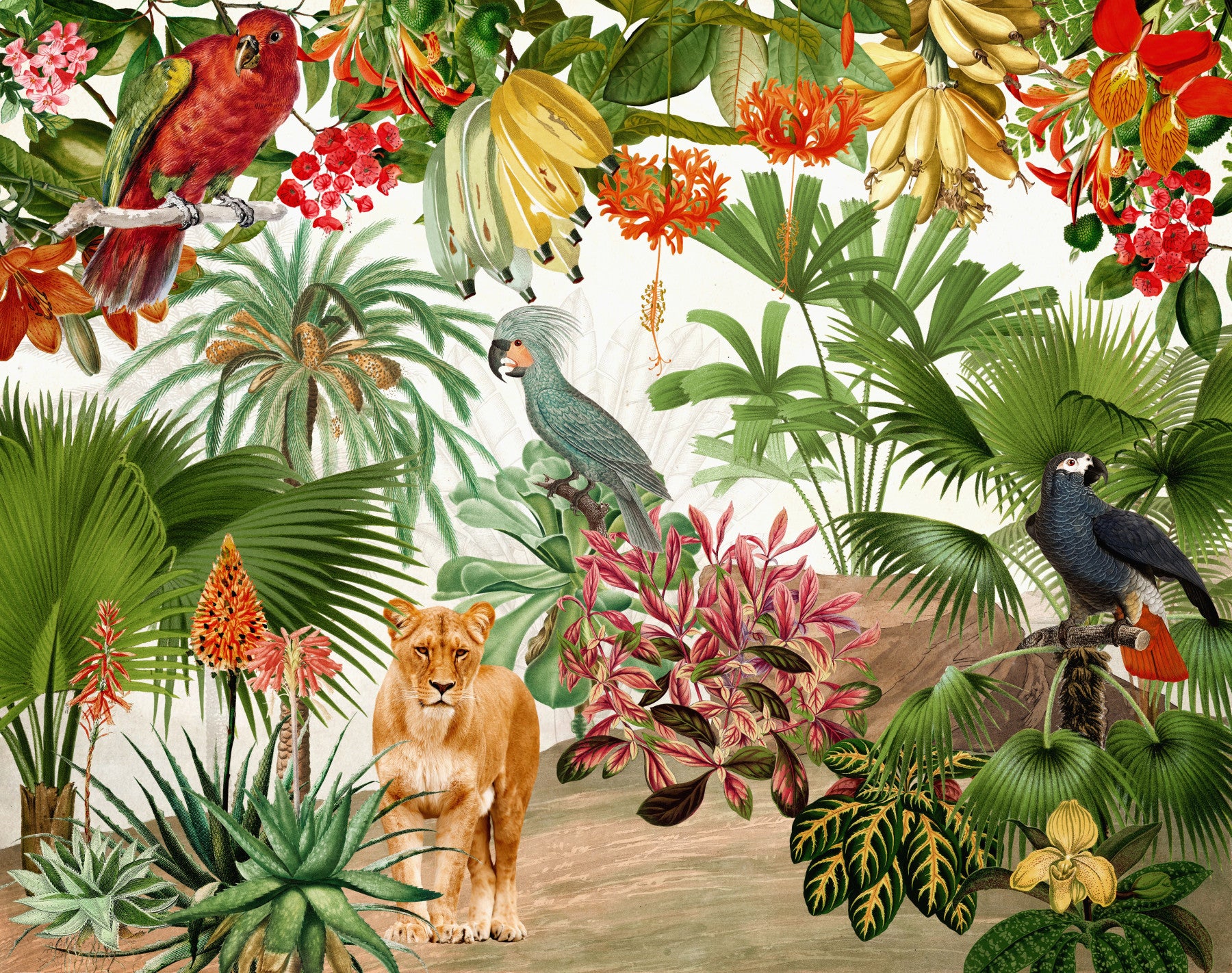 Escape to a world of vibrant color and exotic beauty with 'Tropical Eden.' This wallpaper showcases a captivating scene of lush tropical foliage teeming with life. Bananas, hibiscus flowers, and palm trees are beautifully rendered in a vintage style, complemented by the vivid plumage of various birds and the regal presence of a lioness. The attention to detail in each element creates an immersive experience. The color palette is rich and varied, offering a sense of both energy and tranquility. Ideal for creating a bold statement in any room, 'Tropical Eden' is a celebration of nature's grandeur.