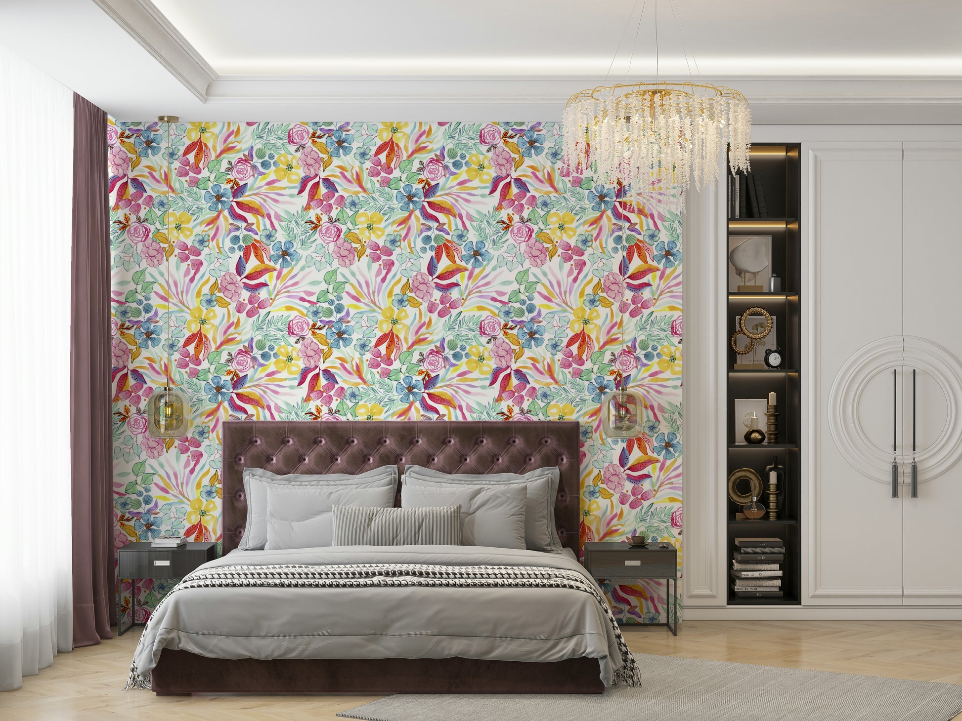 Escape to a vibrant tropical paradise with this stunning watercolor wallpaper. Lush, hand-painted leaves and flowers in a riot of colors create a sense of lively energy and exotic charm. Shades of pink, yellow, and teal are punctuated by bold reds and oranges, evoking the warmth and vibrancy of a tropical getaway. The intricate details and flowing brushstrokes add a touch of artistic sophistication. This wallpaper is perfect for transforming your space into a tranquil oasis, adding a touch of effortless beauty and whimsy to any room. Its vibrant yet balanced color palette makes it versatile for various spaces, from bedrooms to living rooms.