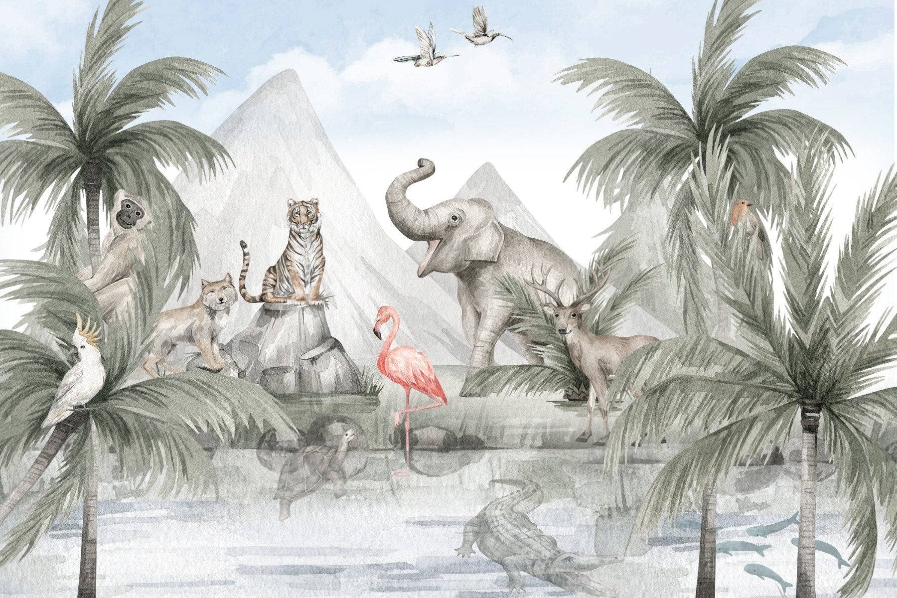 Embark on a daily expedition with the tropical wildlife haven wall mural, where every inch of your wall brims with the vitality of the jungle. This tropical wallpaper is a meticulously curated collection of nature's finest, from the stealthy tiger to the stately elephant, each creature captured in their serene glory. Envision this animal wallpaper as a lively conversation starter, a stunning visual feast that brings the heartbeat of the tropics into your home. The mural stands as a testament to the diversity of the wild, a seamless blend of flora and fauna that promises to enchant and inspire. In this haven, every glance is a journey a lush landscape that beckons with the whispers of adventure. It's not just decor it's an invitation to wander, to ponder, and to connect with the world's exotic beauty, right from the comfort of your room.