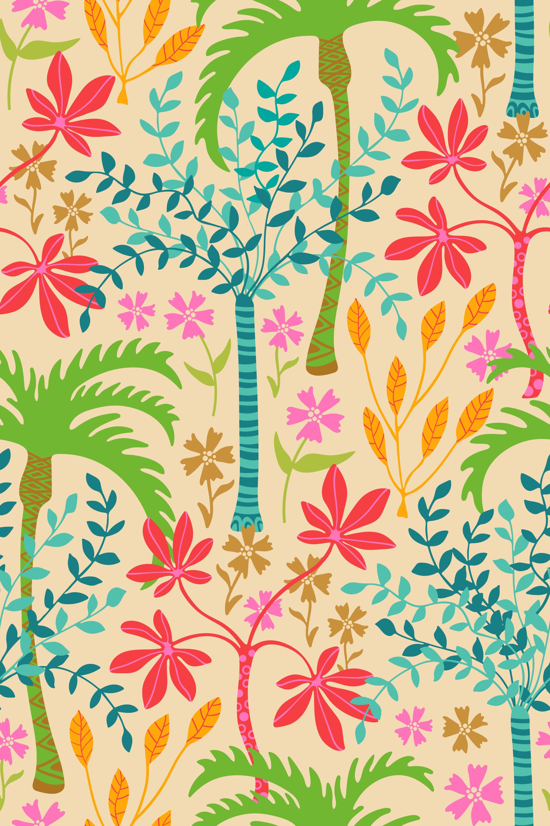 Escape to a vibrant and enchanting world with this stunning Tropicalia tropical floral botanical wallpaper. A lush tapestry of botanical wonders unfolds before your eyes, showcasing an array of exquisitely illustrated palm trees, exotic flowers and plants. Gorgeous rainbow colors burst forth from every corner, on a bright cream background, creating a playful, fun and joyful atmosphere. From the towering palms to the delicate floral blooms and leaves, every element is meticulously crafted to evoke the magic of a tropical paradise. Transform your space into a vibrant oasis, bringing the energy and wonder of a rainforest jungle into your home with this captivating and immersive wallpaper. Ideal for creating a focal point or adding a touch of exotic charm to any room, this design will transport you to your very own dream getaway. Original wallpaper pattern design by Jackie Tahara of UnBlink Studio.