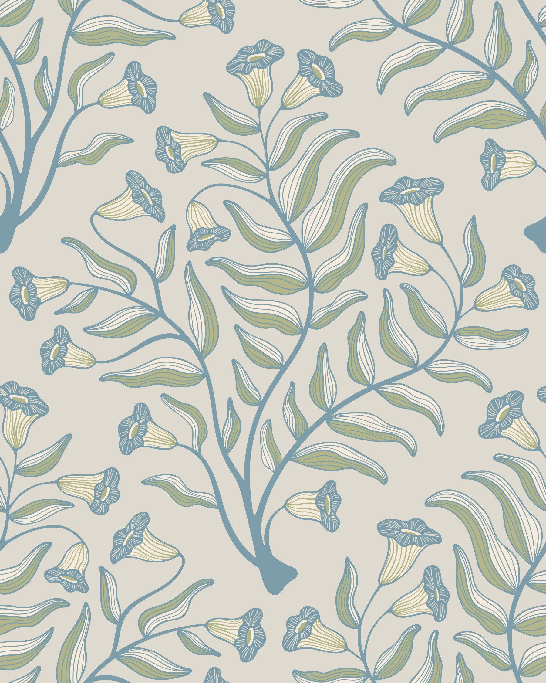 Indulge in the serene beauty of this vintage-inspired floral wallpaper. Elegant trumpet flowers, rendered in soft sage green and calming cottage blue, bloom against a tranquil pale gray background. The stylized botanical design evokes a sense of peaceful cottagecore charm, with delicate damask-like detailing adding a touch of refined sophistication. Perfect for creating a tranquil and stylish atmosphere in any room, this wallpaper seamlessly blends nature's elegance with timeless design elements, offering a calming and sophisticated visual experience. This pattern design is also available in Other Colourways too! Original wallpaper pattern design by Jackie Tahara of UnBlink Studio.