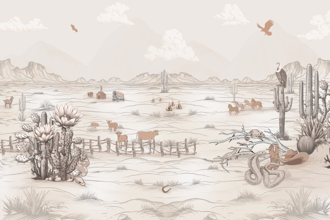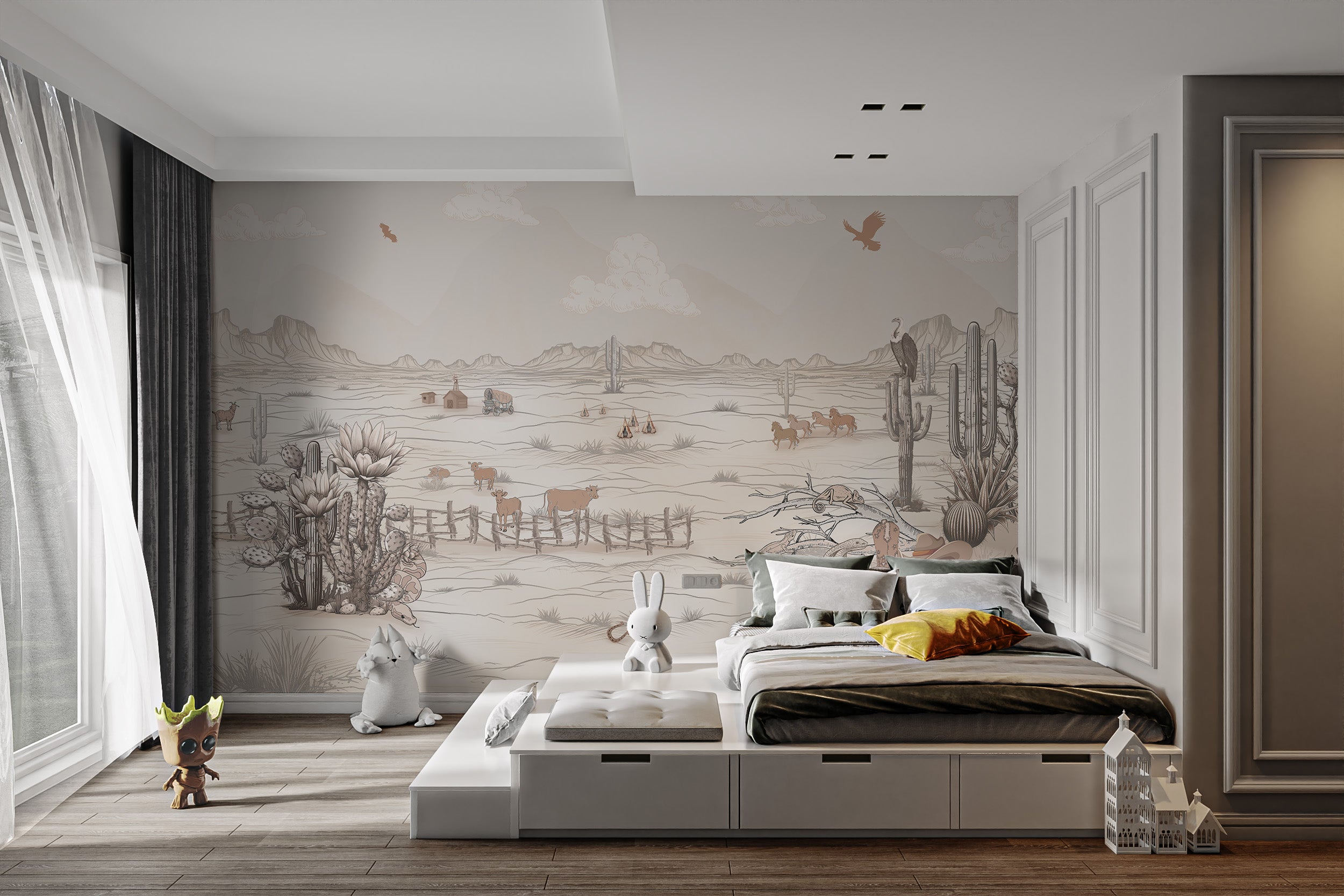 Bring the untamed beauty of the West straight to your slumber sanctuary with the tumbleweed treasures wall Mural. Imagine drifting to sleep under the expansive desert skies this bedroom wallpaper is a portal to the rugged wilderness. Cacti stand tall, cattle roam free, and the wide-open landscape stretches beyond the horizon. Every inch of this panoramic piece tells a story of serene life in the plains, wrapped in hues that whisper tales of adventure and mystery. It's a celebration of nature's raw majesty, crafted to blend seamlessly with your personal space. Transform bare walls into a frontier of imagination and let the spirit of the wild elevate every moment spent in your bedroom's embrace.