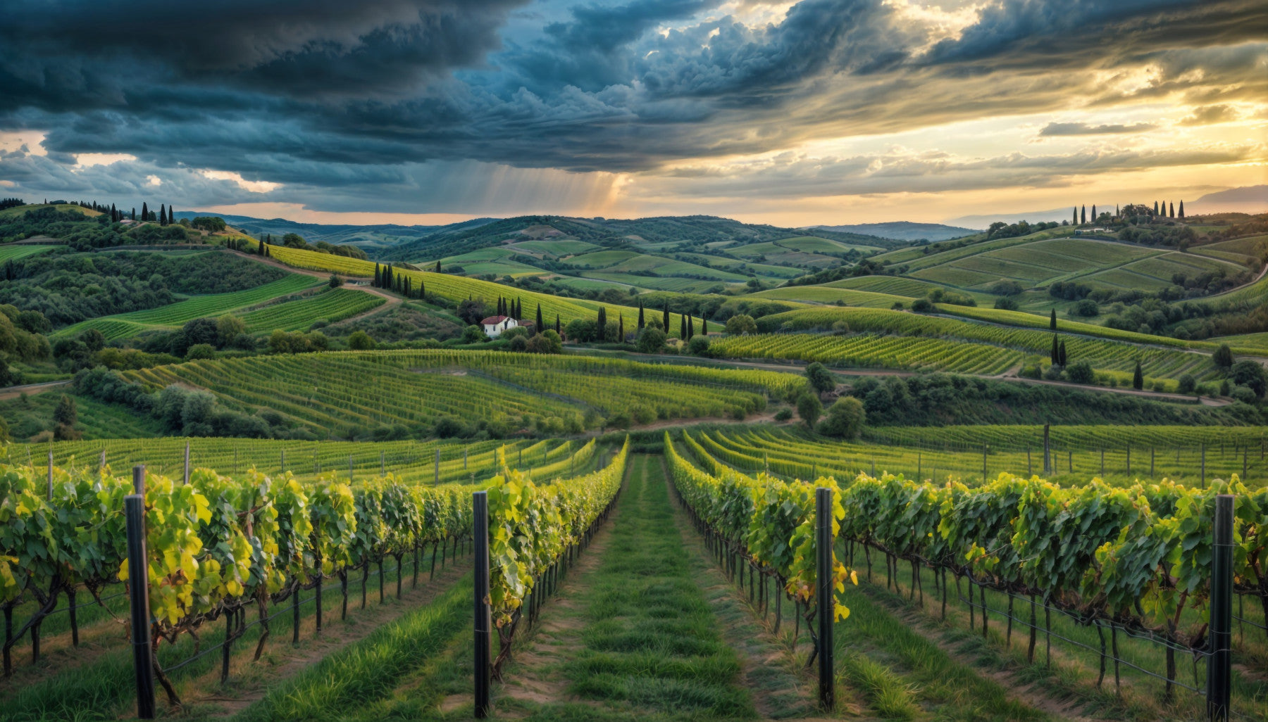 Escape to the picturesque landscapes of Tuscany with this stunning wallpaper. The image captures the essence of the region's rolling hills, meticulously cultivated vineyards, and the dramatic interplay of light and shadow. A storm gathers on the horizon, casting a captivating contrast against the golden hues of the setting sun. This wallpaper evokes a sense of tranquility and wonder, transporting you to a place of serene beauty. The lush greens of the vineyards, complemented by the dramatic sky, create a visually arresting image, perfect for adding a touch of sophisticated natural beauty to your home.