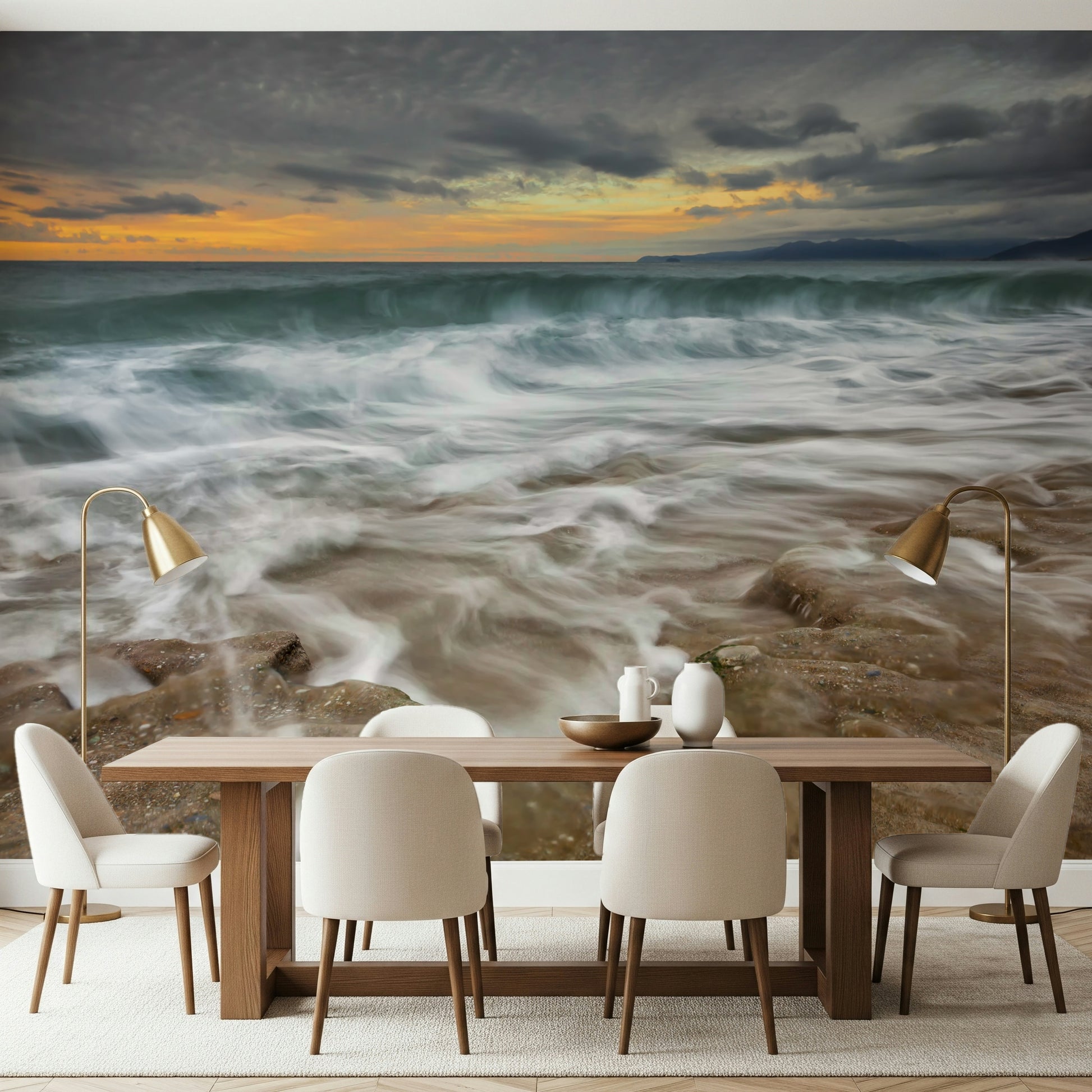 Bring the serene energy of the sea to your space with this mesmerising wallpaper for walls. The long exposure captures the water's motion, creating a smooth, almost dreamlike effect. Shades of grey, blue, and hints of sunset yellow bring a peaceful touch. This design enhances living rooms, bathrooms, or hallways. It adds depth and connects your interior to the calming rhythm of nature.