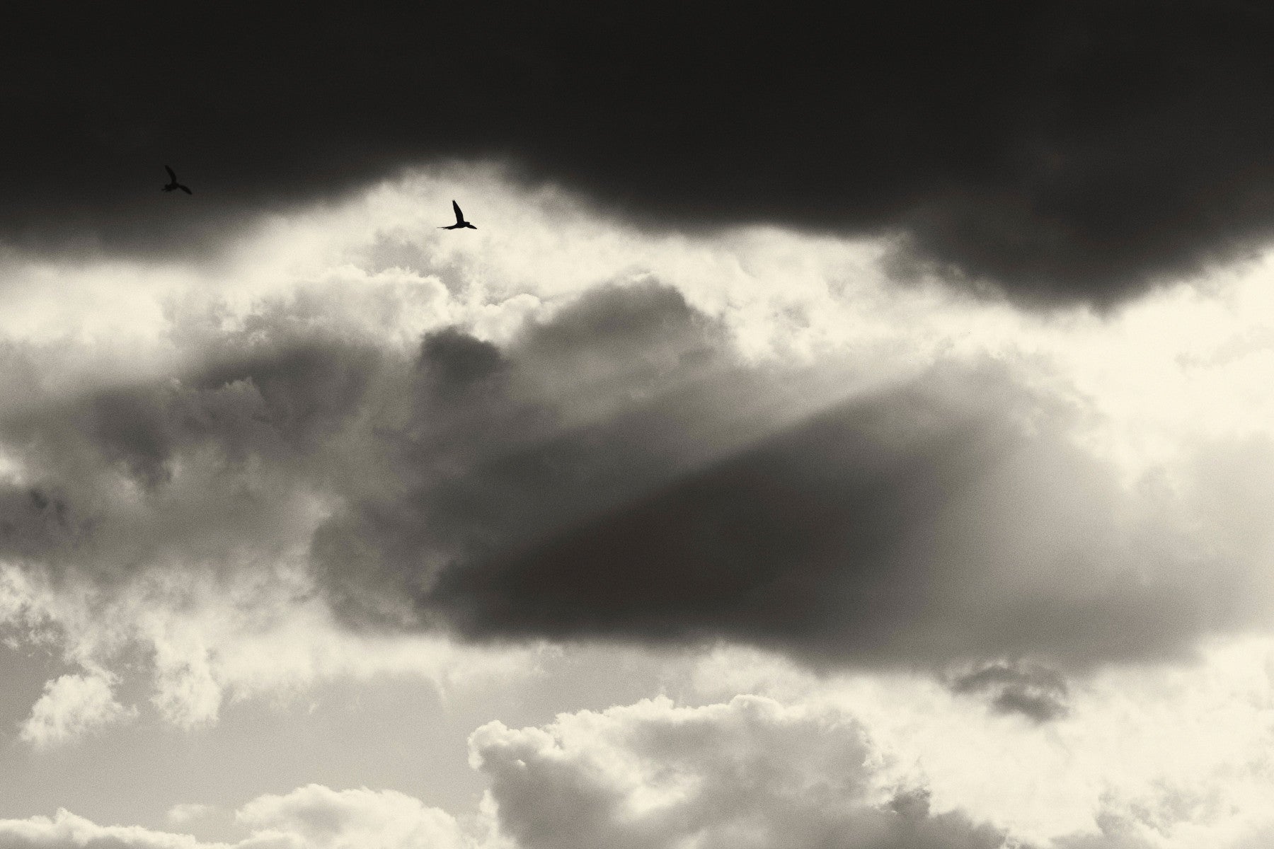 Embrace the ethereal beauty of Two a monochrome masterpiece that captures the poignant dance of existence. This wallpaper features a dramatic sky, rendered in shades of grey, where light struggles to break through the dense, brooding clouds. The scene is punctuated by two solitary birds, silhouettes against the tumultuous canvas. Their presence evokes feelings of companionship, resilience, and the enduring power of connection against a backdrop of overwhelming forces. 'Two' is a meditation on duality: light and shadow, presence and absence, solitude and togetherness. Let this striking image transform your screen, reminding you of the strength found in pairs and the beauty found in contrast. Perfect for those who appreciate minimalist aesthetics with a touch of evocative storytelling.