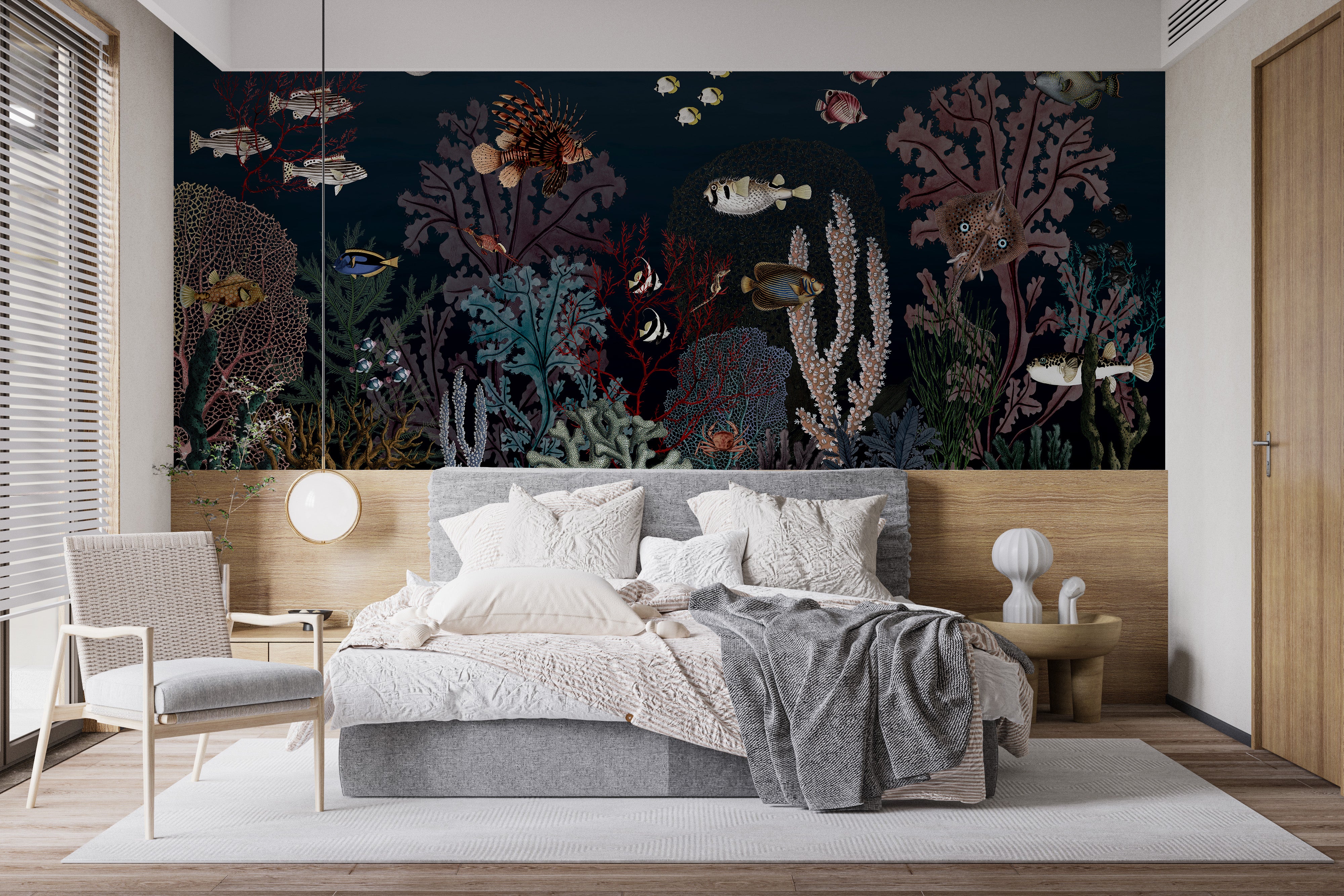 Embark on a mysterious underwater journey with our Dark Reef with Fish Wallpaper for the kids' room. This captivating mural features shadowy depths teeming with colorful fish and hidden treasures, sparking curiosity and imagination in any young explorer. The dark backdrop accentuates the vivid colors of the marine life, creating a dramatic and engaging scene. Perfect for nurturing a love for the ocean and its mysteries, this underwater wallpaper invites adventure and discovery. Turn your child's room into a deep-sea dive where every glance reveals new wonders.