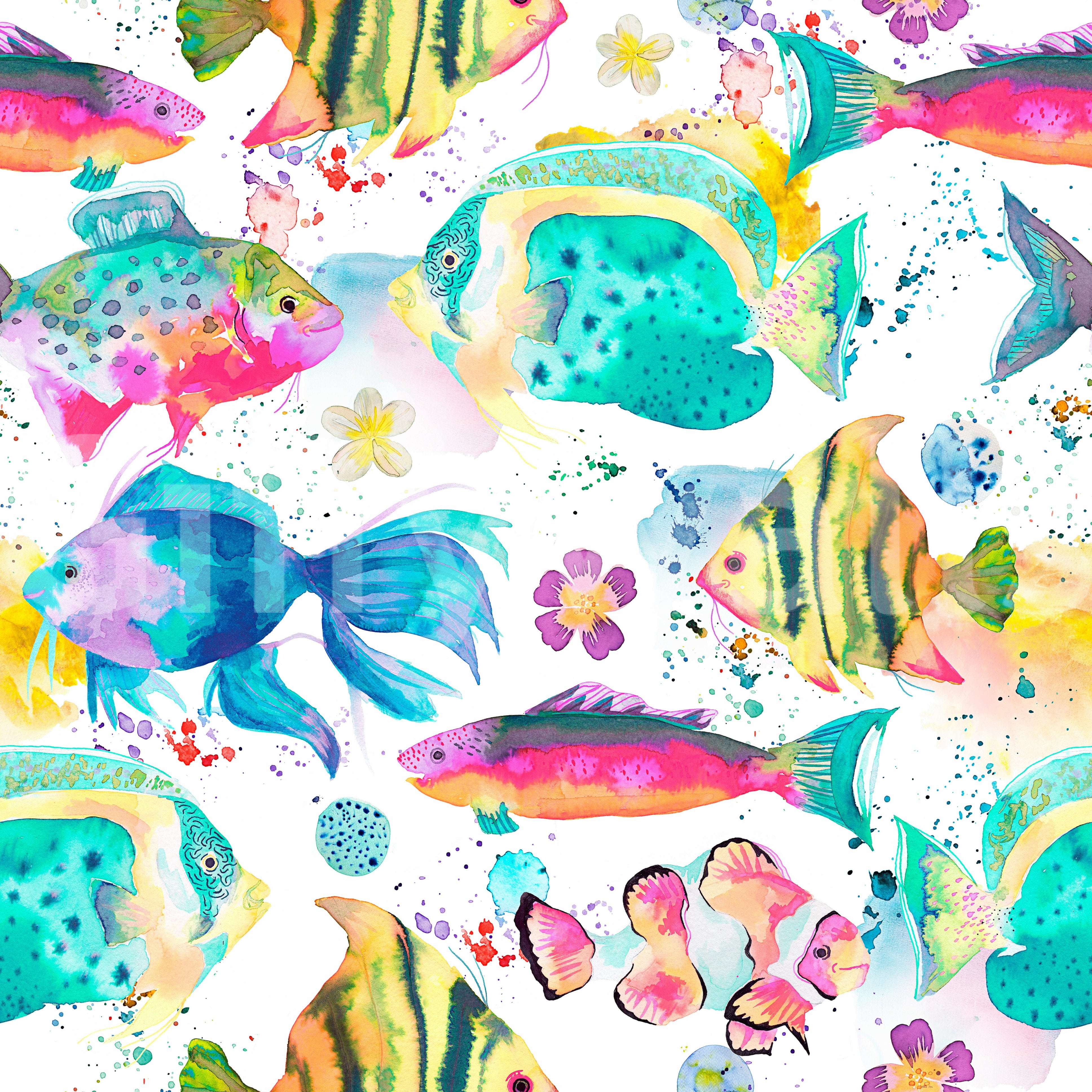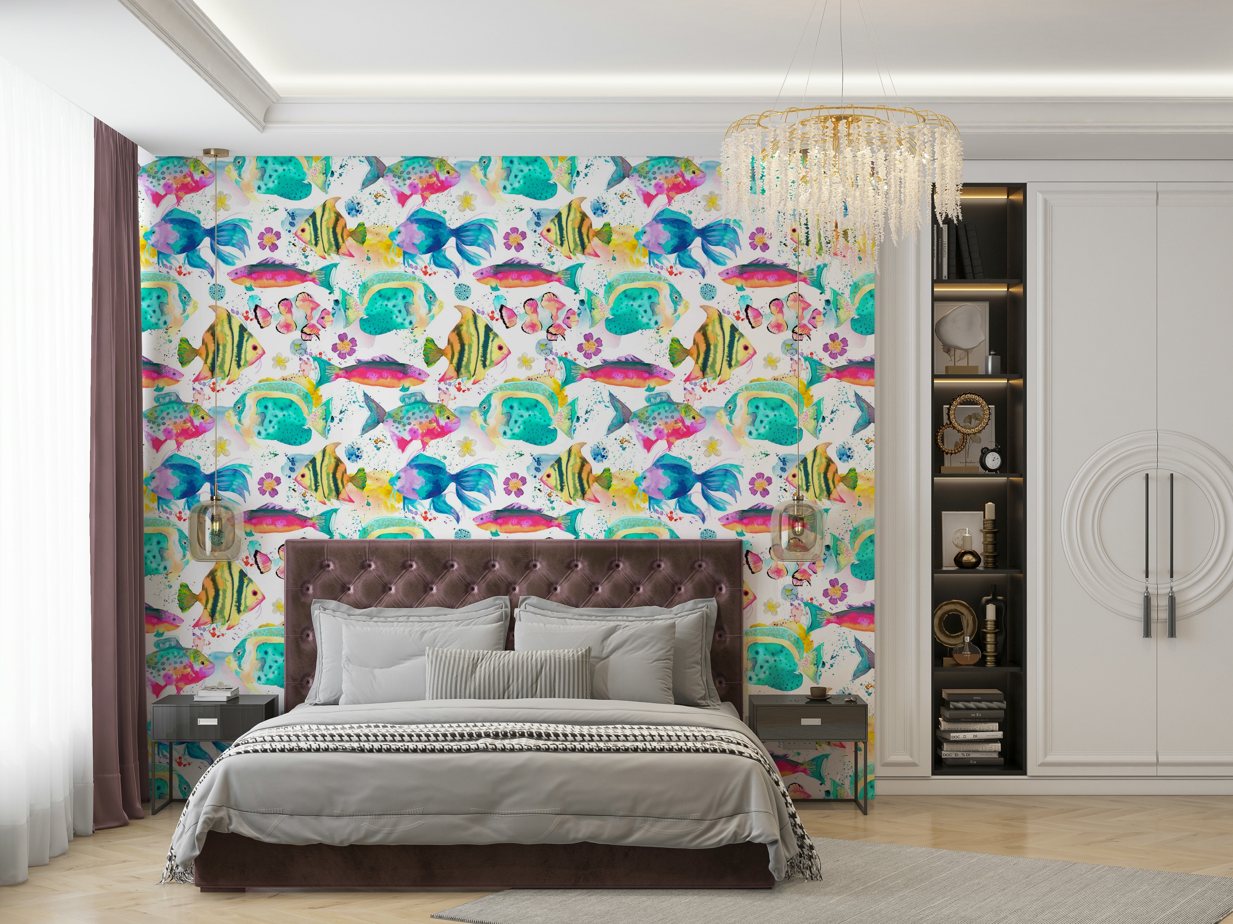Fun and vibrant fish wallpaper perfect for kids' or beach-themed rooms.