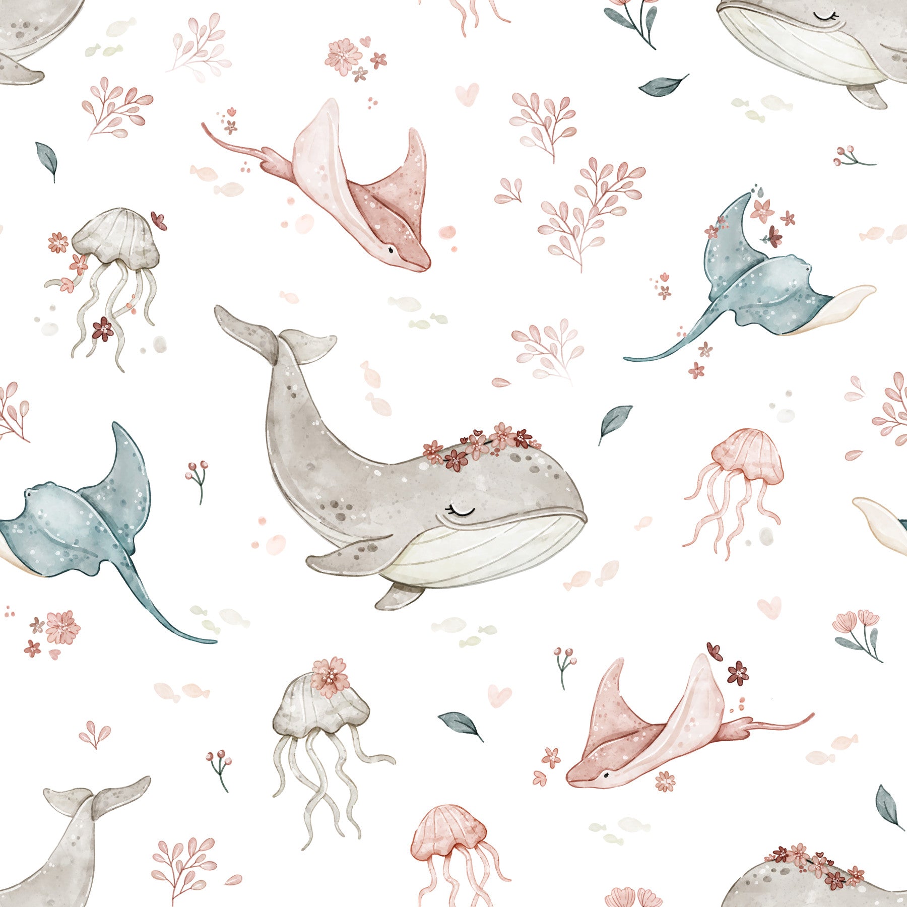 Dive into a serene underwater world with this enchanting wallpaper. Delicate watercolor illustrations depict graceful whales adorned with floral crowns, alongside elegant stingrays and whimsical jellyfish, all swimming amidst a scattering of soft pink and peach blossoms and delicate sea foliage. The calming color palette and charming character designs create a peaceful and dreamy atmosphere, perfect for adding a touch of whimsical elegance to any space. This wallpaper is a beautiful blend of marine life and floral artistry, ideal for those who appreciate a touch of magic and tranquility in their home decor.