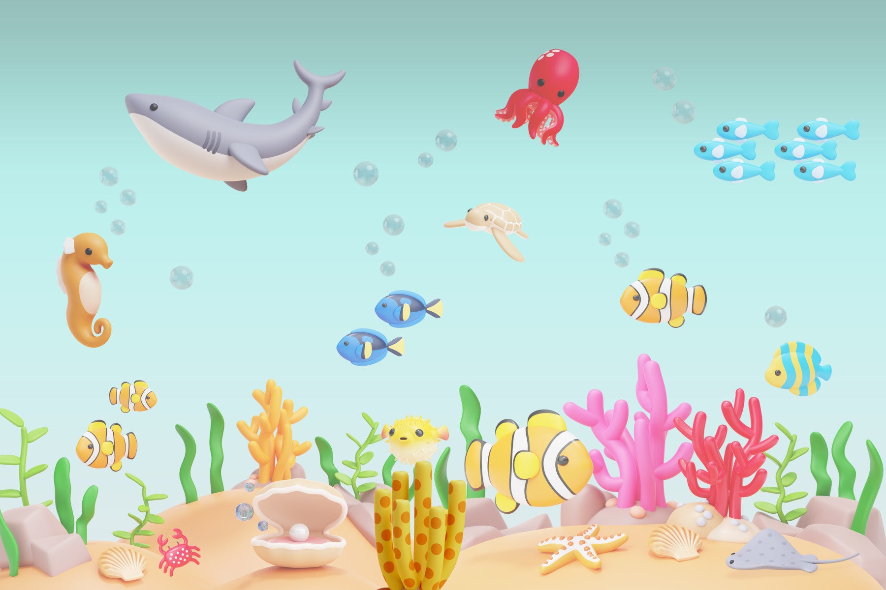 The design features a group of friendly cartoon sea animals and coral.