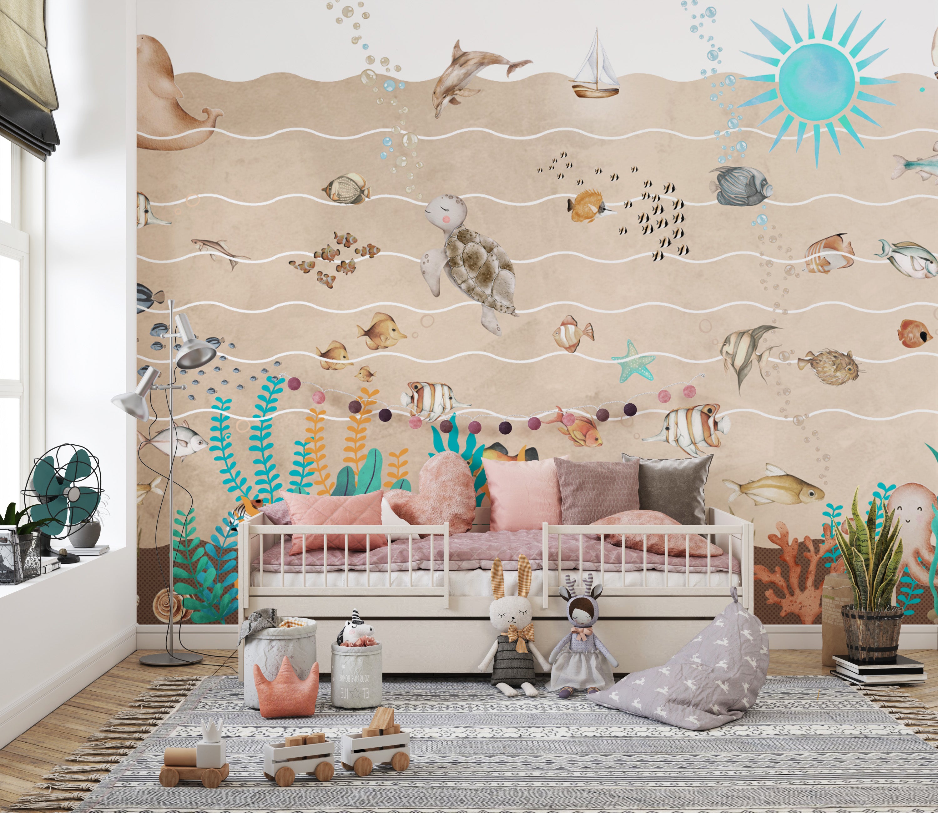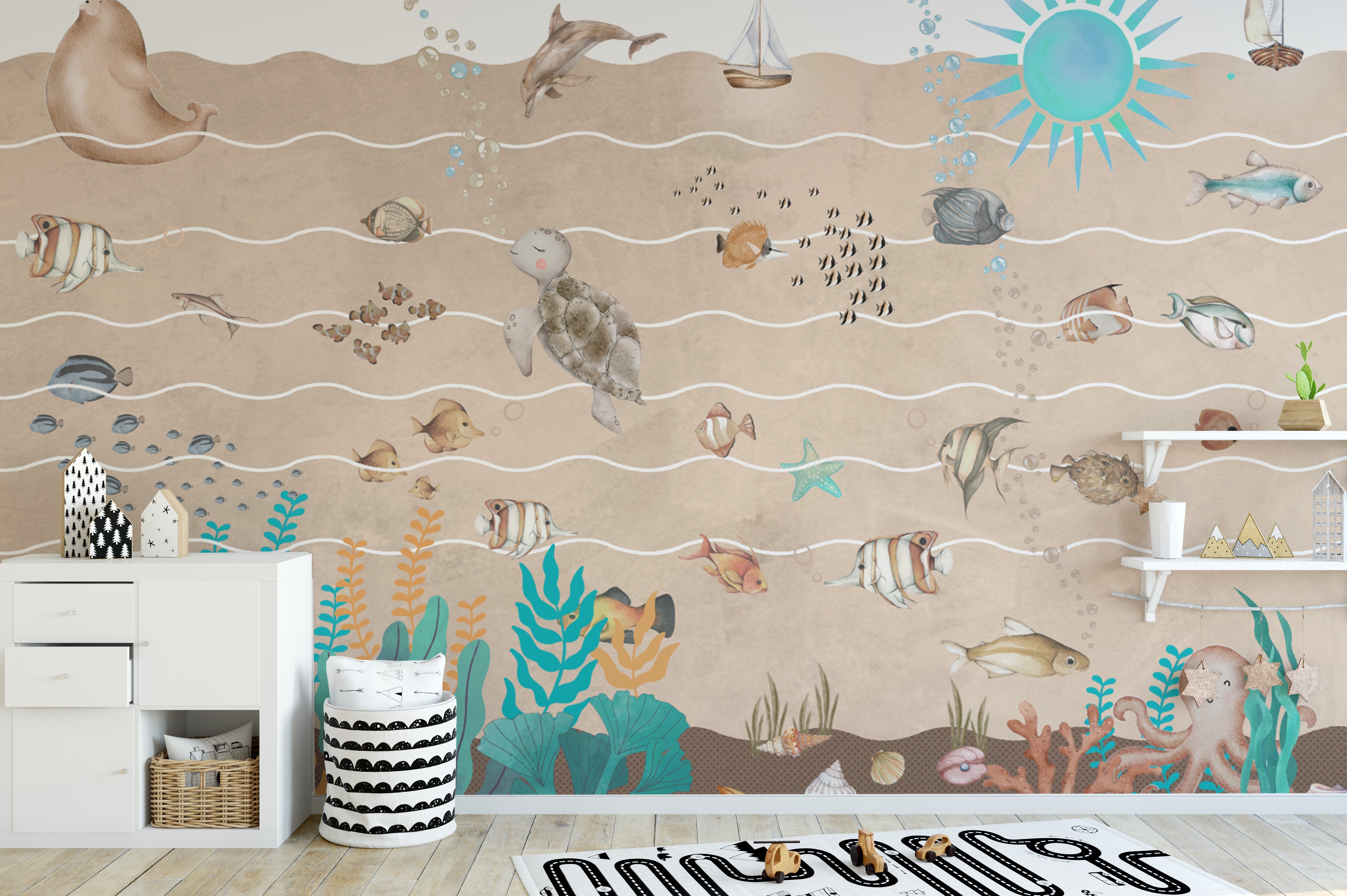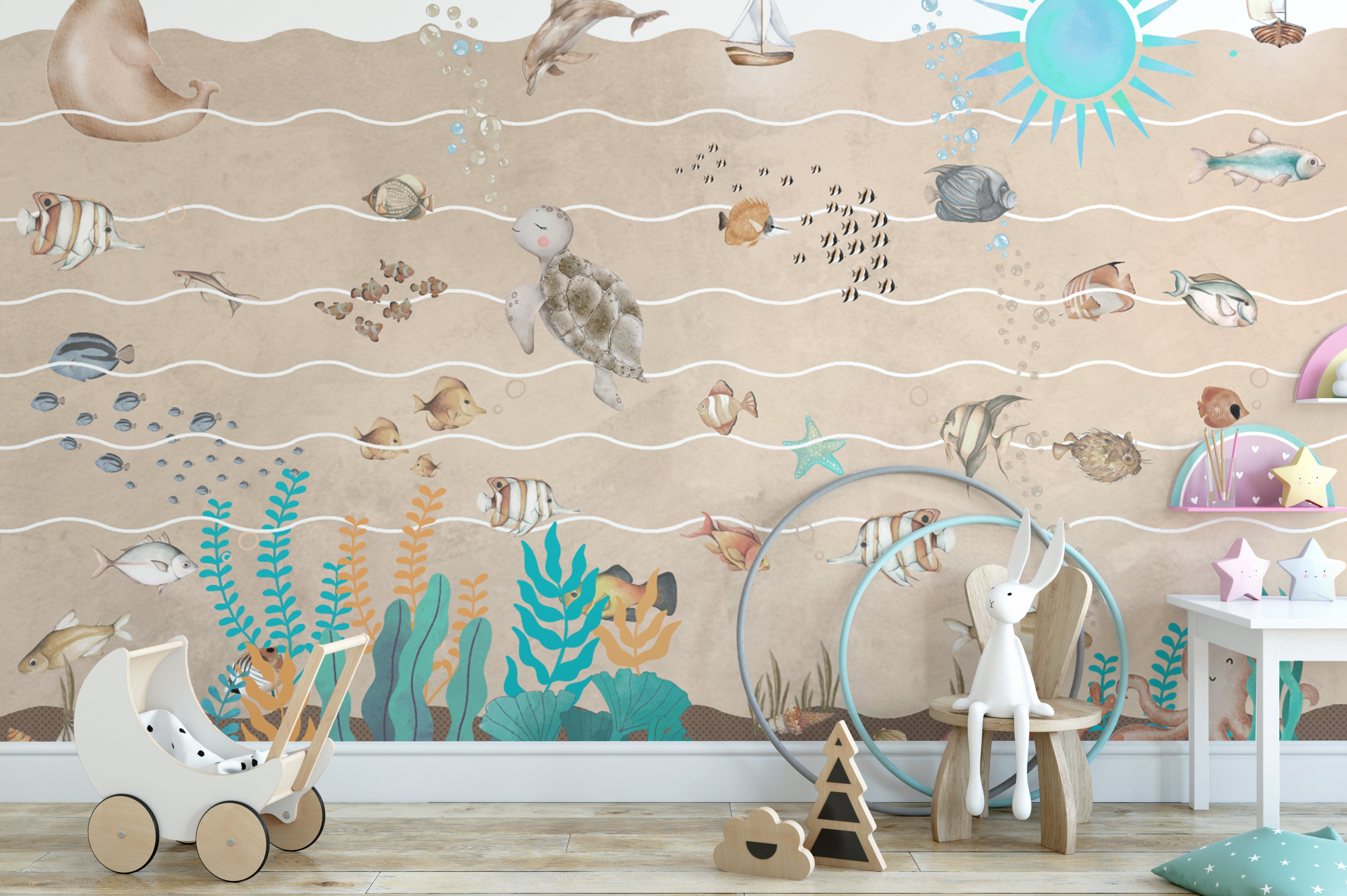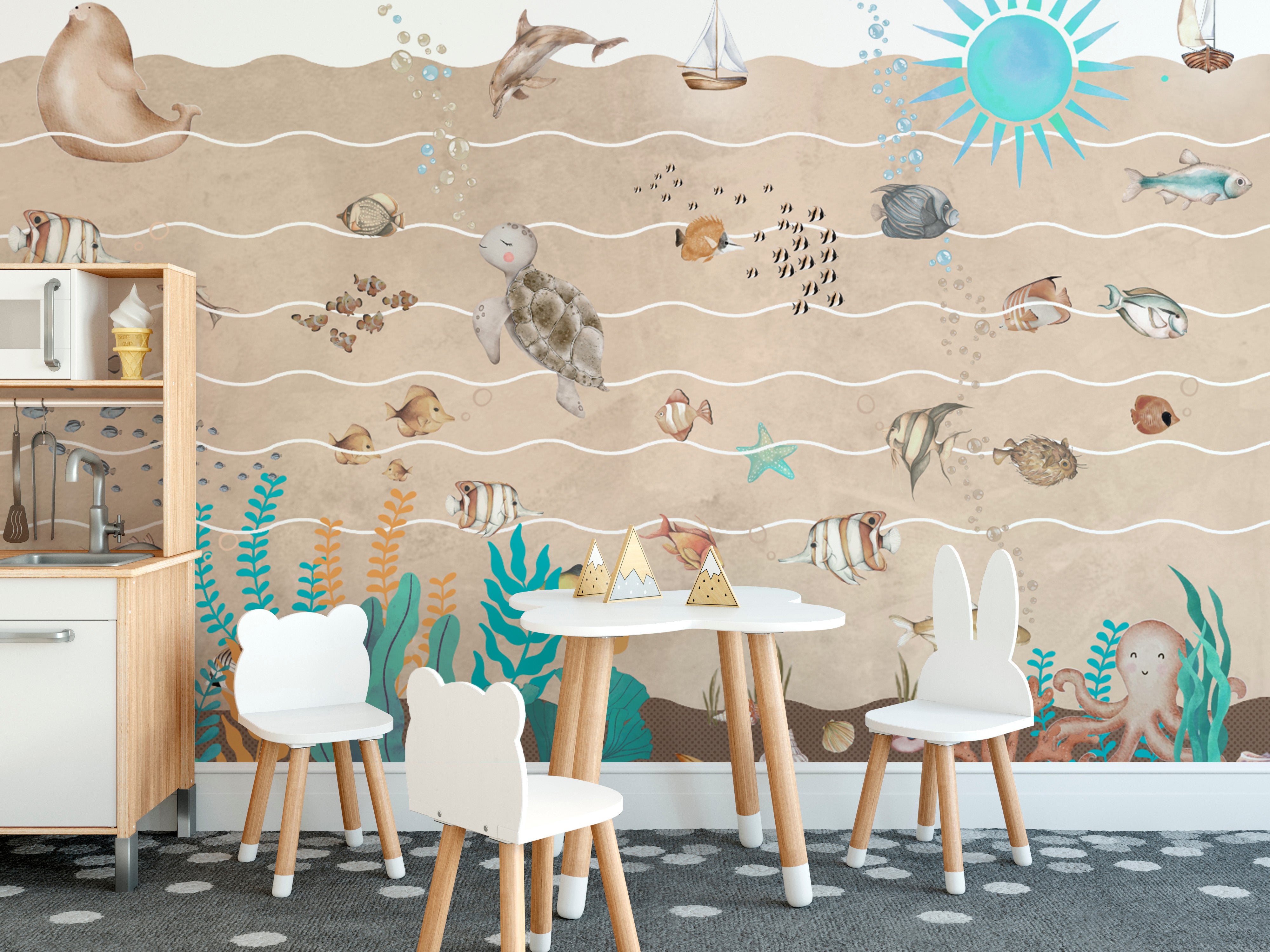 Bring the beauty of the ocean to your walls with the underwater sea life wallpaper mural. This captivating design features dolphins, sea turtles, colorful fish, and coral reefs, creating a lively marine scene. The soft watercolor effect adds charm, making it ideal for kids' rooms and nurseries. Crafted with premium materials, the mural offers durability and a stunning visual experience. The playful sea creatures add a sense of wonder, perfect for an ocean-themed setting. Enhance bedrooms or play areas with this ocean-themed wallpaper, designed for a seamless finish. Refresh any space with a vibrant sea life mural.