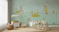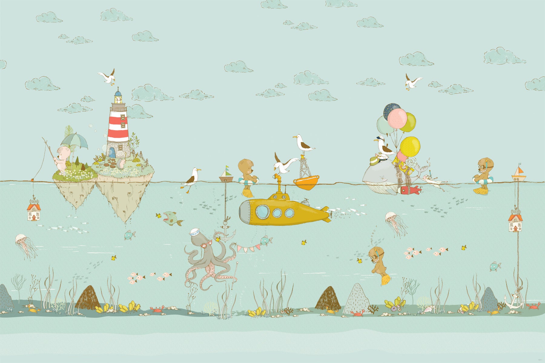 Dive into a world of playful charm with this captivating wallpaper for walls. It features a lighthearted underwater scene with adorable bears, a cheerful yellow submarine, and whimsical sea creatures. Gentle pastel tones and hand-drawn details create a soothing atmosphere. Perfect for nurseries, kids' rooms, or playrooms, this design adds a touch of imagination. The design complements interiors with its sweet characters and calm palette.