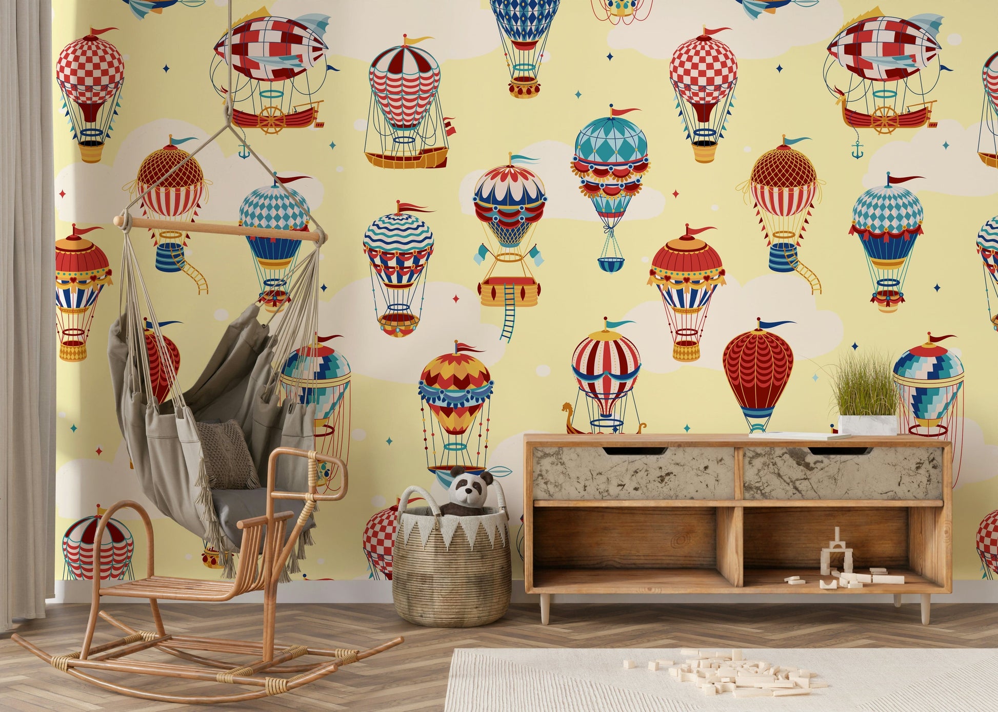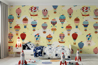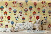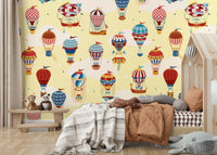Take flight with this playful hot air balloon design. The delightful pattern features an array of colourful balloons with whimsical details against a light yellow backdrop. This wallpaper for walls makes a statement in a nursery, kids' room, or playroom, adding a sense of adventure and joy. The cheerful design seamlessly blends with modern, vintage, or eclectic decor styles.
